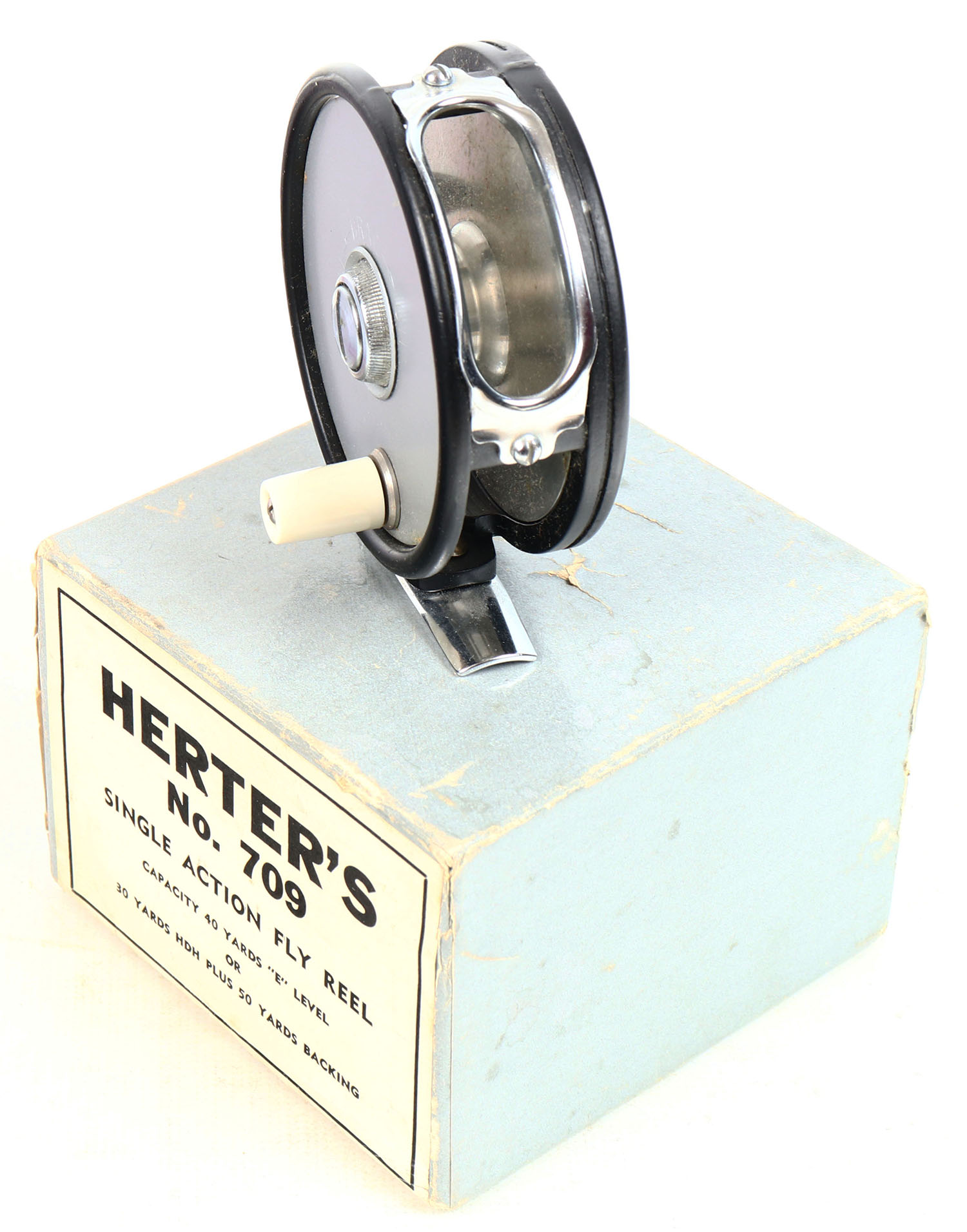 Herter's No 709 single action fly reel in the original box with paperwork, 40yds ''E'' level or 30yds HDH plus 50 yds backing. Grade: Excellent ++ - Value: 10 to 50