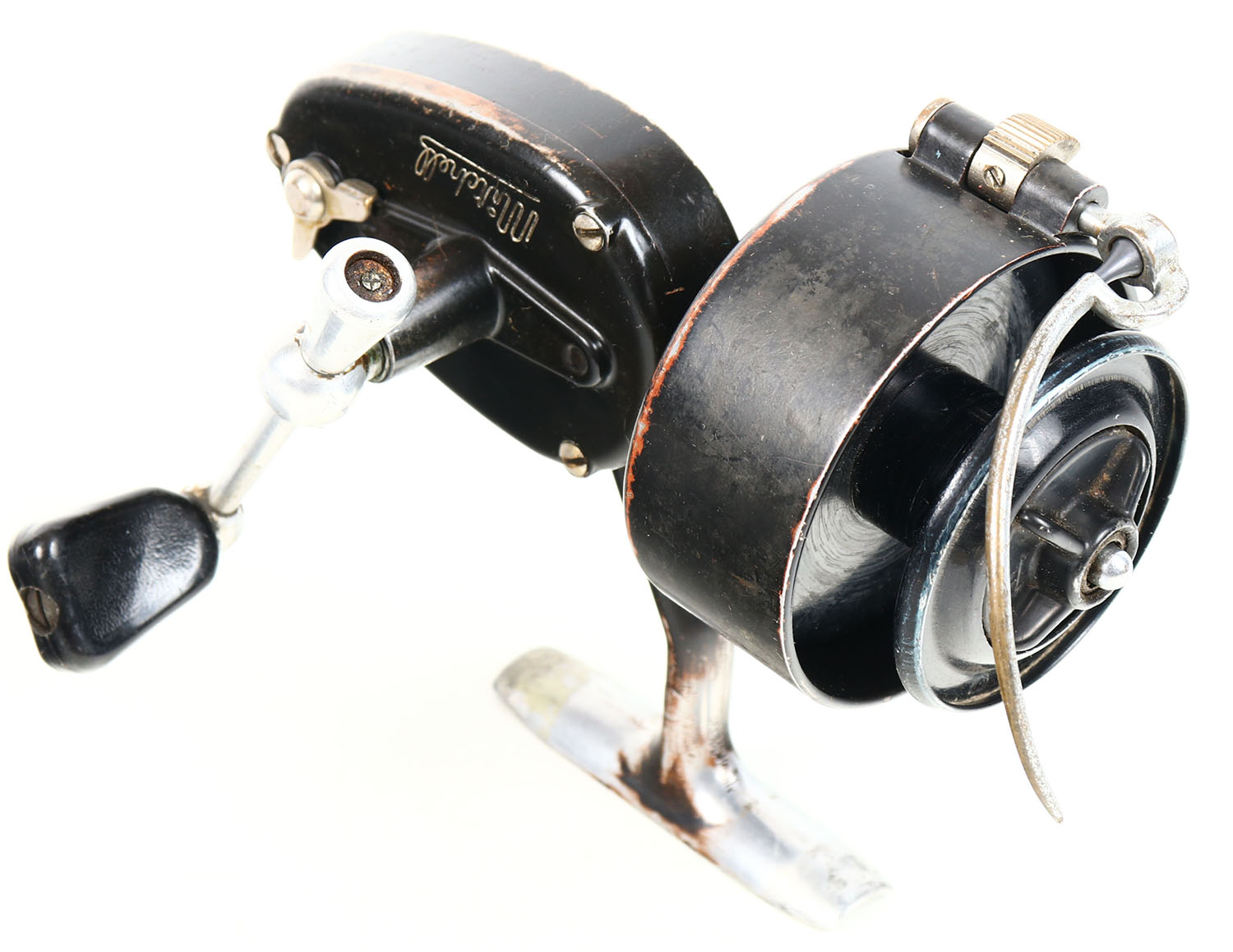 Mitchell Half bail spinning reel, early rare & collectible, shows in use wear but works well. Grade: Very Good ++ - Value: 50 to 75