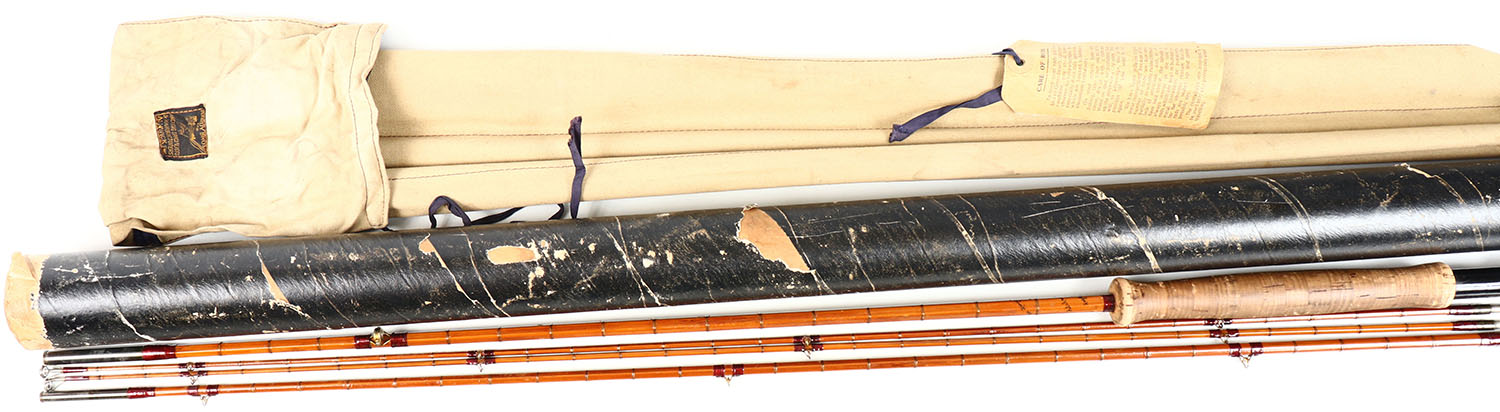 RARE Hardy's Bros. Bamboo Fly Rod, PALAKONA, 3/2, 8', 5wt., butt of rod is marked ''Made by Hardy's England, S/N: E61650, base of rod is marked ''THE KENYA ROD, PALAKONA, REGD TRADE MARK'', has original cloth bag with logo, has two original paper tags on bag, one has info tag with matching S/N E61650, the other tag is how to care for rod, deep red wraps are all excellent condition, red agate guide, cork handle is slightly used, has what appears to be original unmarked cardboard tube, Very Rare & hard to find complete with matching S/N's Grade: Excellent + - Value: 200 to 800