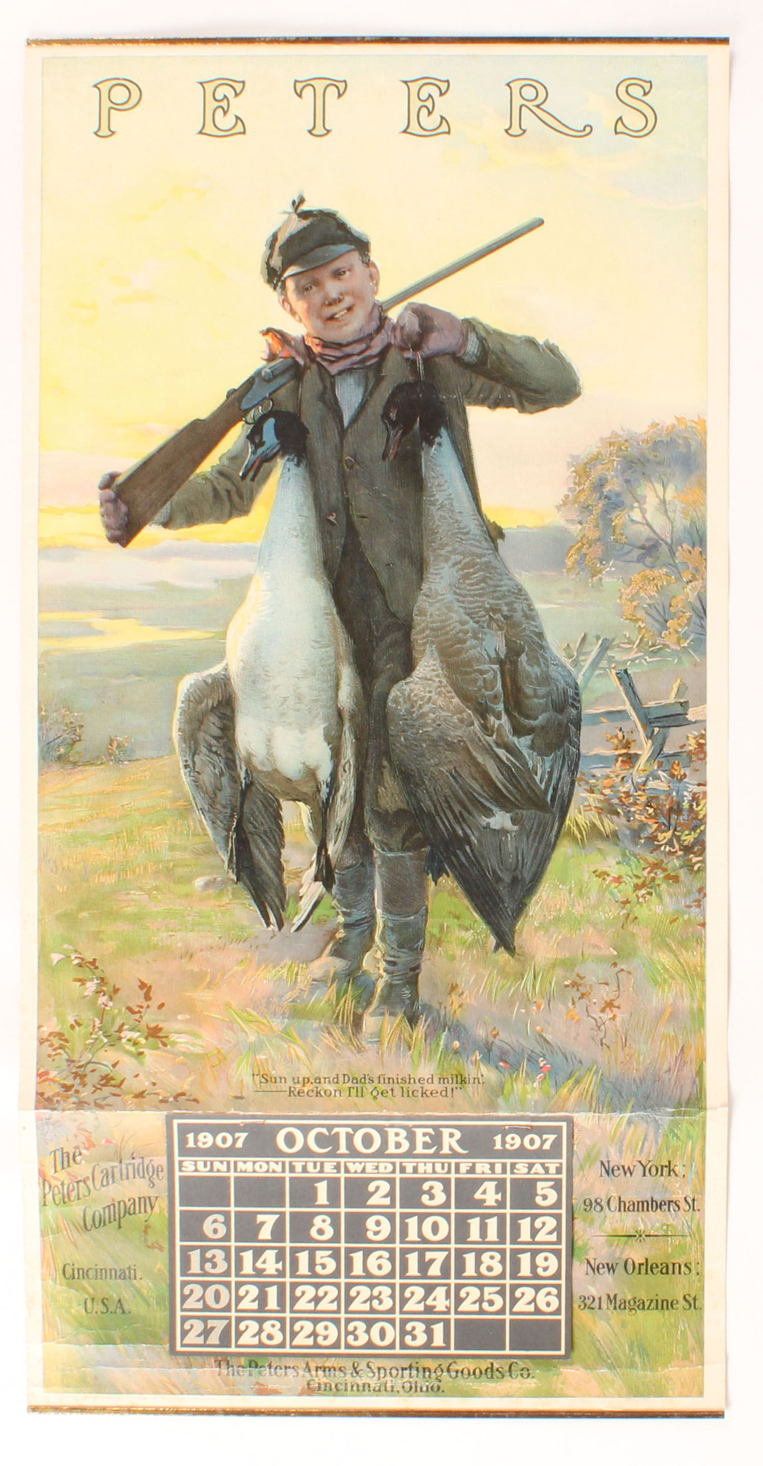 VERY RARE 1907 Peters Calendar, ''SUN UP, AND DAD'S FINISHED MILKIN, RECON I'LL GET LICKED, Pictures boy with two geese over his shoulder & a double shotgun, BANDS TOP & BOTTOM, October Page, 14'' x 27 5/8'', this is the best example known to exist, no edge wear, one light crease just above page, fantastic colors, very attractive & extremely hard to find, only a hand full of these known & this is the best of best condition wise, you can not improve on this one! Grade: Excellent ++ - Value: 8000 to 12000