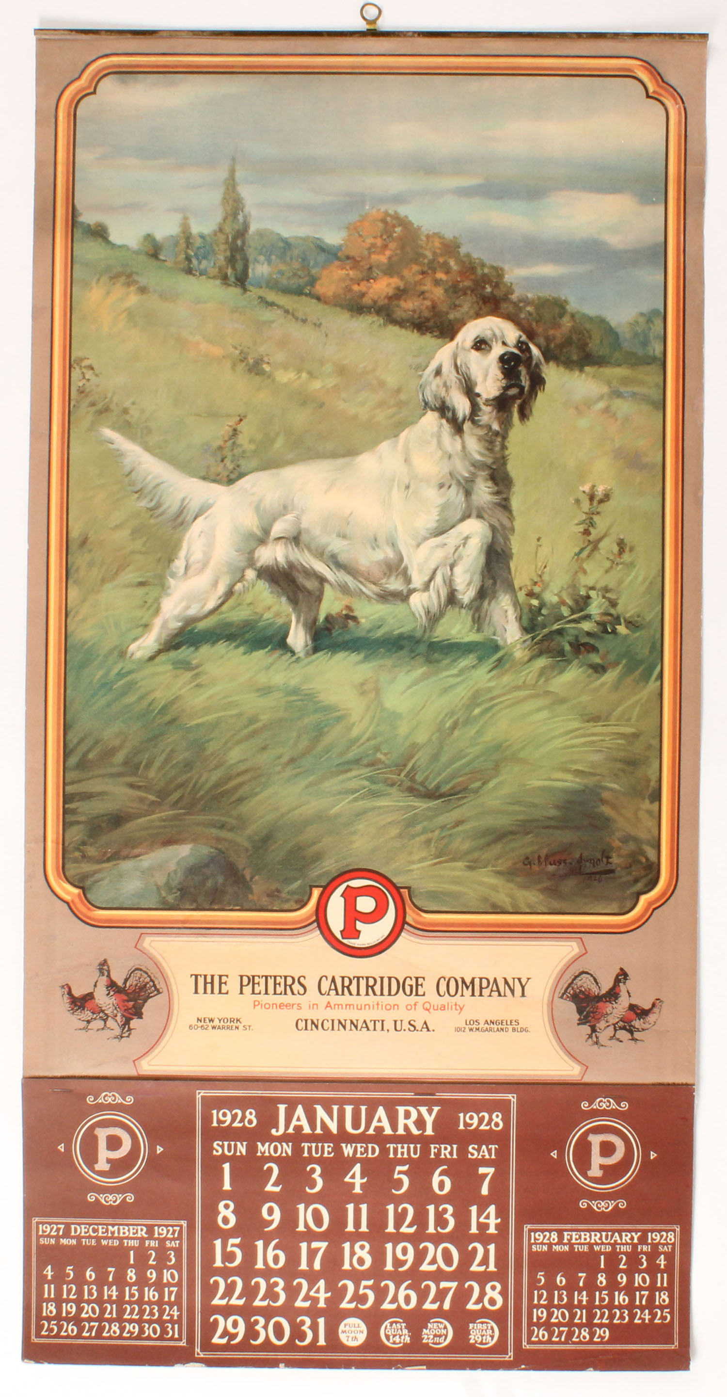 1928 Peters Calendar by G. Muss Arnolt, Pictures hunting dog on point, brass band on top with brass hanger, this one never had a band on the bottom, FULL PAD OF PAGES, 15'' x 30'', NO roll wrinkles with one repaired tar to left side just above dogs tail, calendar has bright vivid colors, framed. Grade: Excellent - Value: 600 to 1500