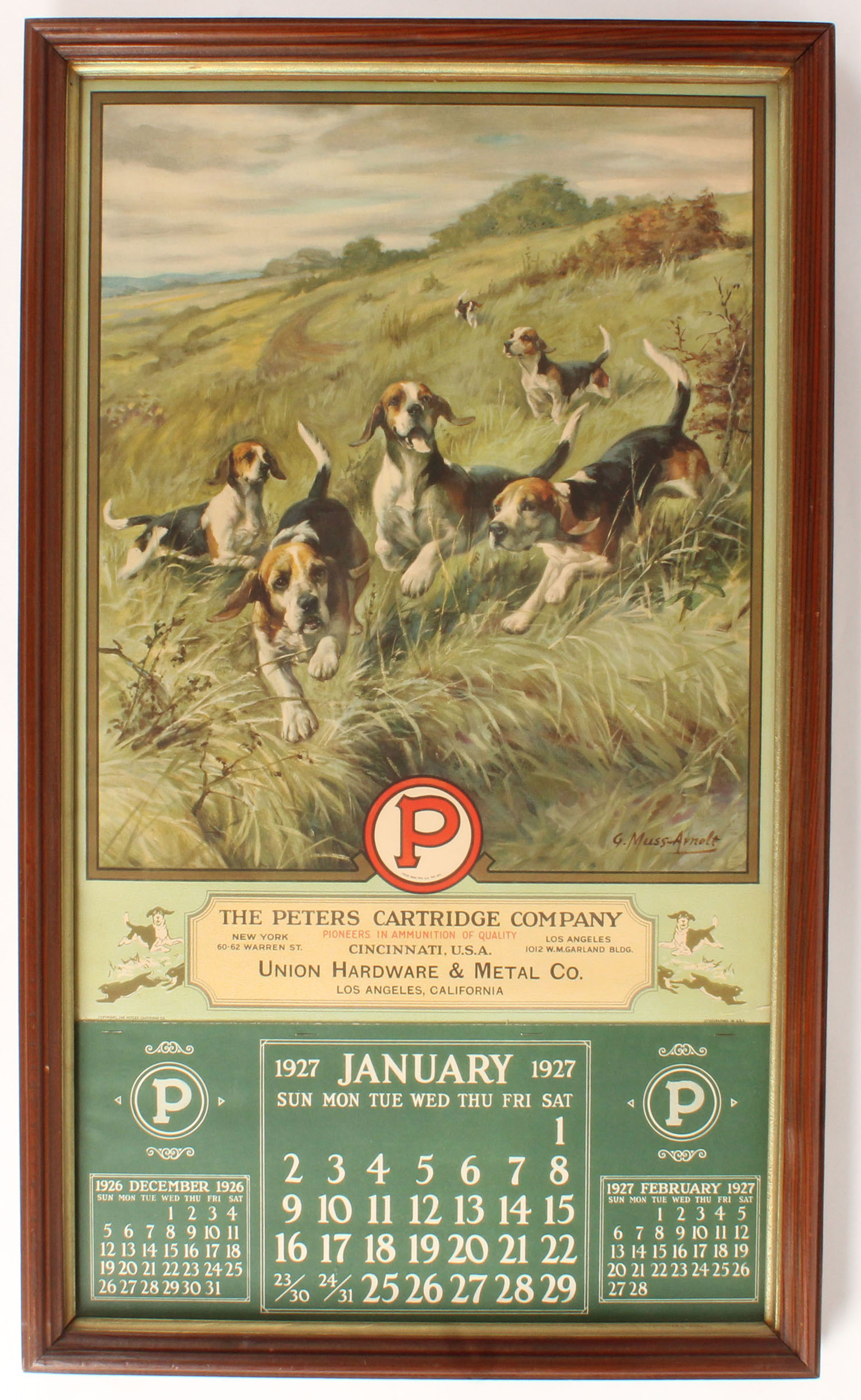 1927 Peters Cart. Co. Calendar, Artist G. Muss Arnolt, pictures six Beagles romping in a field, no top band & brass hanger, (this calendar never had a bottom band from factory), 15'' x 26 1/2'', full pad of pages, near perfect with two small tears to sides above pages, original condition, framed. Grade: Excellent + - Value: 250 to 500
