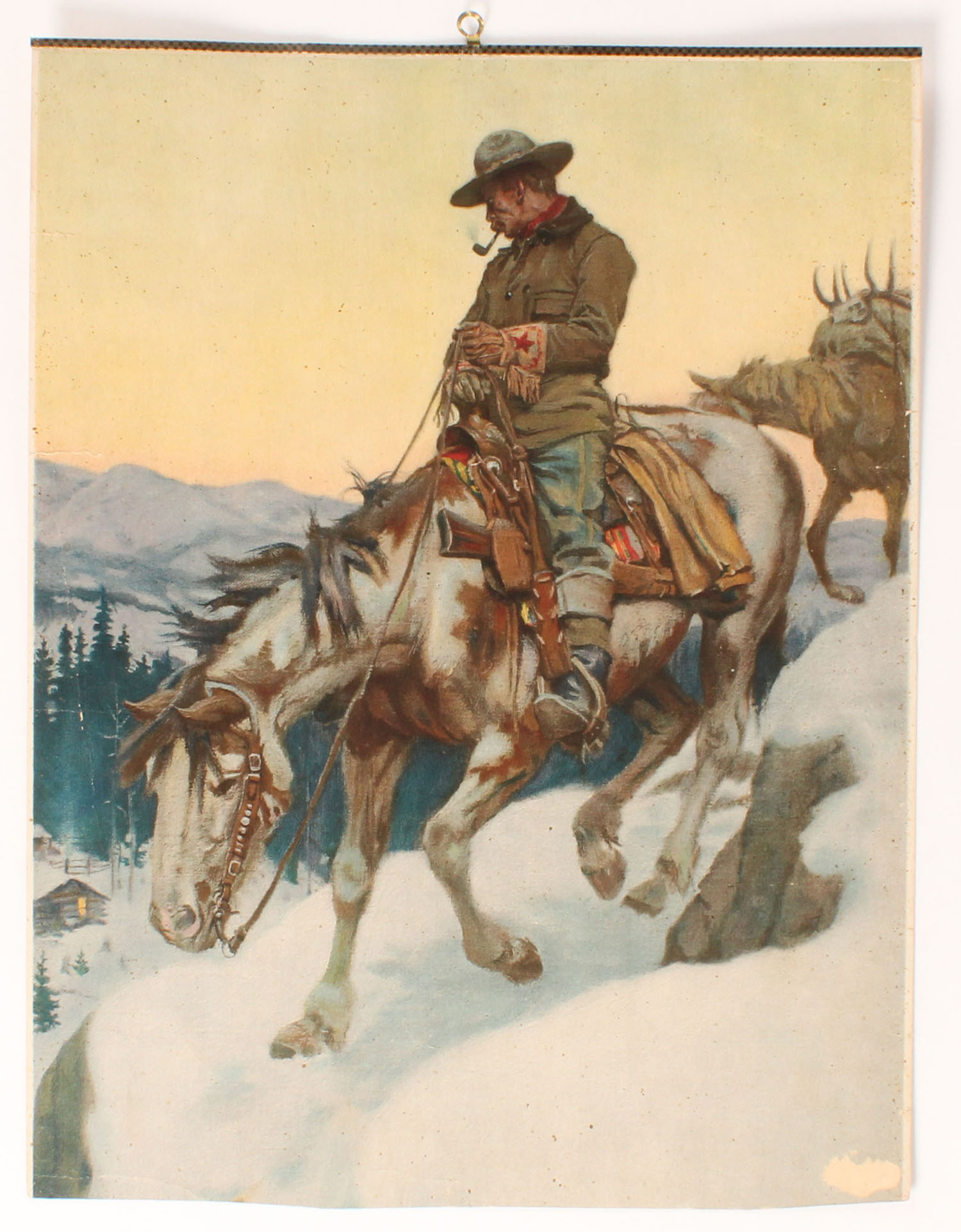 1907 Winchester Calendar TOP by Philip R Goodwin, wonderful full color image of TEDDY ROOSEVELT on horseback in the snow headed back to his log cabin with bull elk on pack horse, this is a very rear & hard to find calendar & coveted by all collectors, has brass band on top with brass hanger, shows light wear to edges, 15 3/4'' x 20 1/2'', Only one we have ever seen for sale. Grade: Excellent - Value: 1000 to 5000