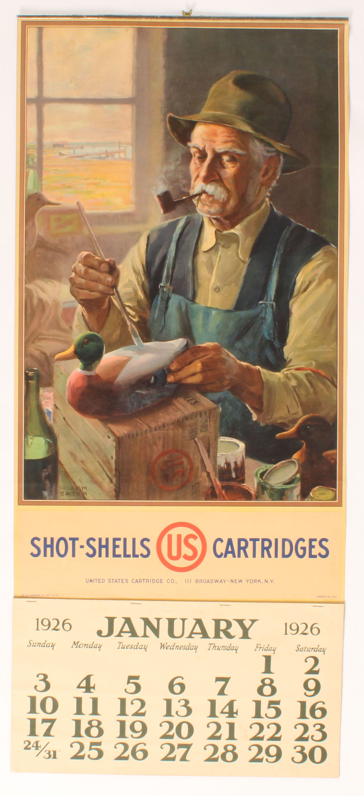 1926 U.S. Cart. Co. Calendar, pictures a great full color image of old duck hunter painting hand carved decoy, cabin by William Eaton, 15'' X 34'', has metal band on top with brass hanger, Full pad of pages, all original and mint condition, great colors & image, Calendar pages are not attached, Hard to find calendar. Grade: MINT - Value: 1000 to 4000