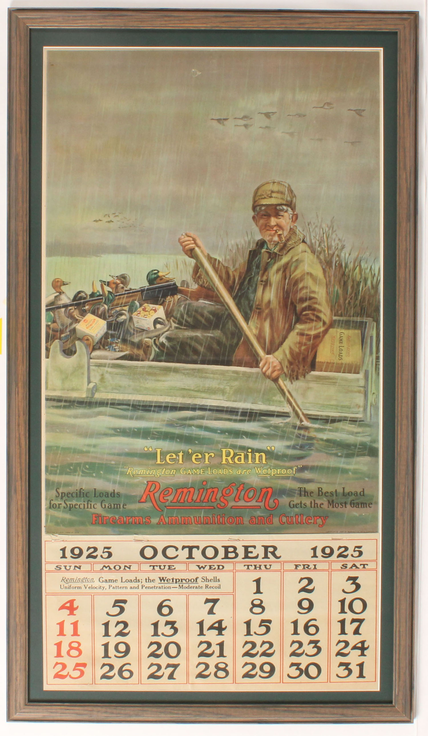 1925 Remington ''LET'ER RAIN'' Calendar, pictures duck hunter in duck boat with decoys, 2pc. Shotshell boxes & an Auto loader, 15'' x 28 1/2'''', metal band on top with brass hanger, Oct. Page, has one small tear to top center otherwise near mint, wonderful colors, great duck hunting image, framed. Grade: Excellent + - Value: 3000 to 6000