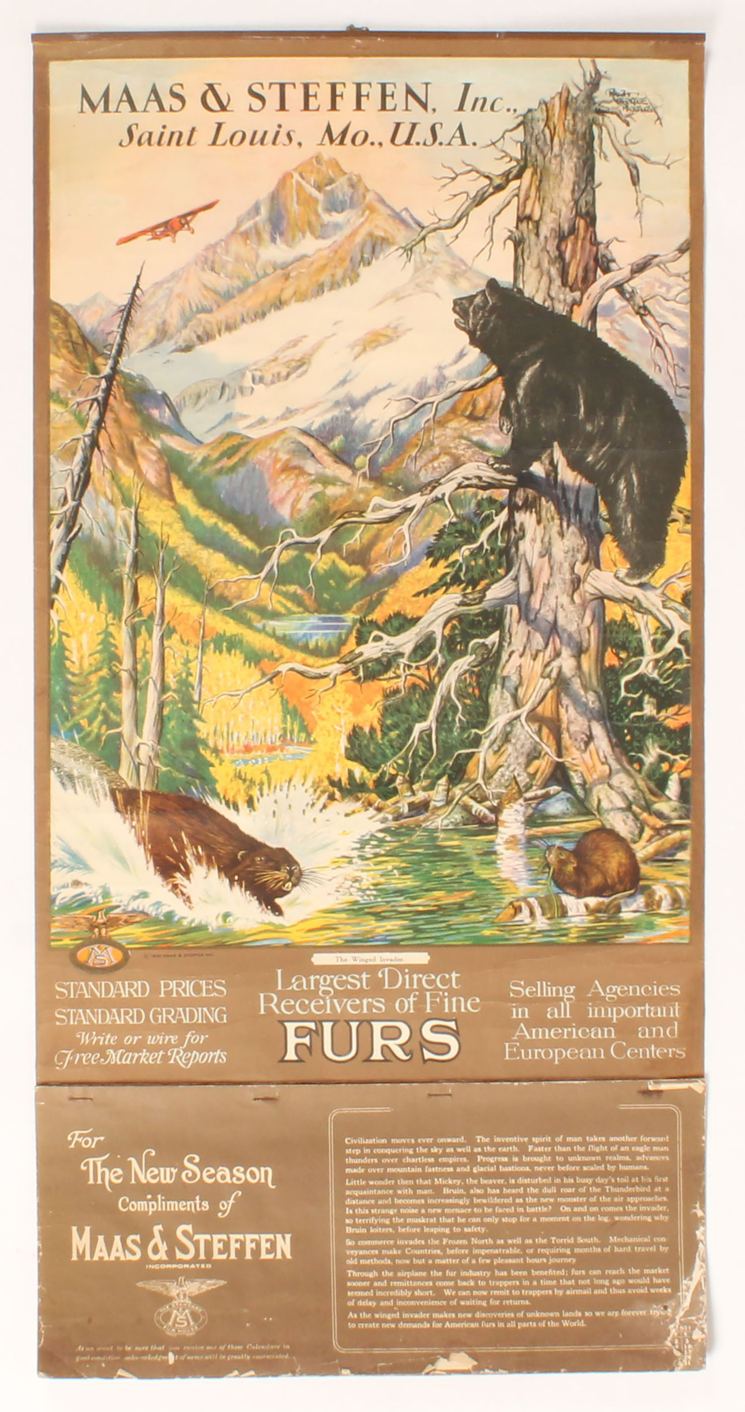 Mass & Steffen 1930 Calendar, ''THE WINGED INVADER'', pictures red airplane flying over a lake & creek with many animals looking up, 13 1/2'' x 27 1/4'', has original band with brass hanger, shows some edge wear with light roll wrinkles to top only, Full Pad of Pages, has great color with beautiful image. Grade: Excellent - Value: 800 to 2000