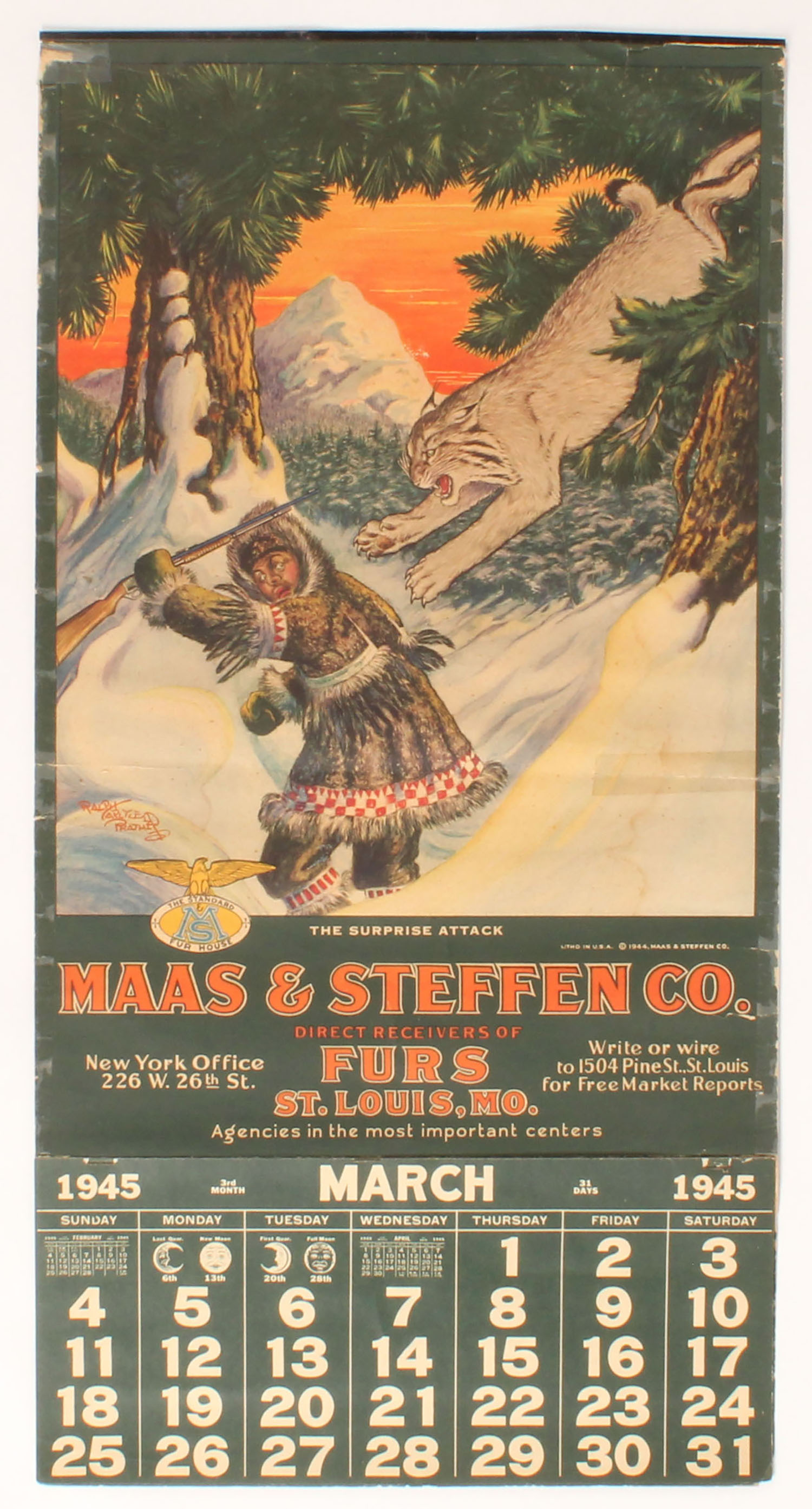 Mass & Steffen 1945 Calendar, ''THE SUPRISE ATTACK'', pictures lynx's attacking an Eskimo in snow mountain scene, 13 1/2'' x 26 3/8'', has original band with paper hanger, shows some edge wear & a tape repair to right side, March - Dec pages, has very nice color with beautiful image. Grade: Very Good ++ - Value: 500 to 1000