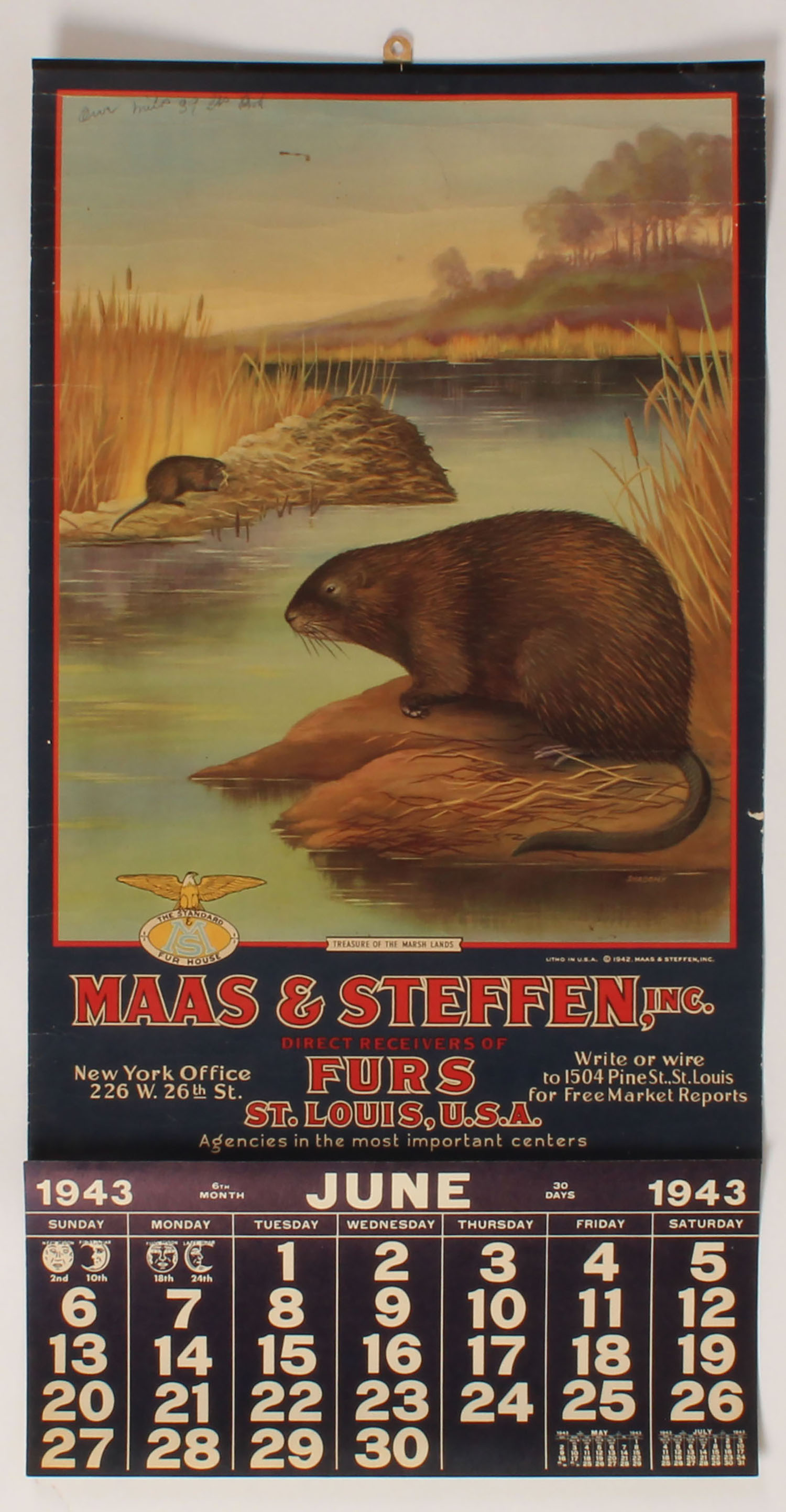 Mass & Steffen 1943 Calendar, ''TREASURES OF THE MARSH LANDS'', pictures nutria on ponds edge, 13 1/2'' x 26 1/4'', has original band with paper hanger, shows pencil writing to top & a small stain, page is not attached, June page, has great color with beautiful image. Grade: Excellent - Value: 300 to 1200