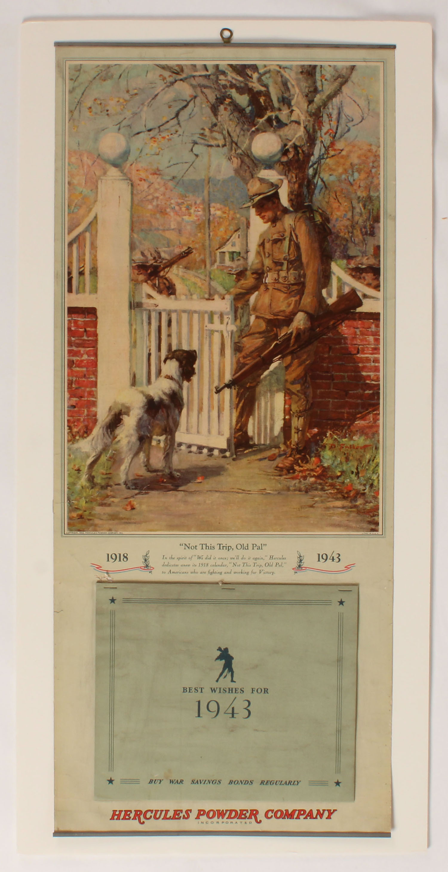 1943 Hercules Calendar, ''NOT THIS TRIP OLD PAL'' full color image of solider headed to war & saying good by to his hunting dog, 13'' x 30 1/4'', has metal bans to top & bottom with brass hanger, full pad of pages with cover sheet, small tear to left edge, pages have come loose from the calendar but are still all intact as a unit. Grade: Excellent - Value: 200 to 400