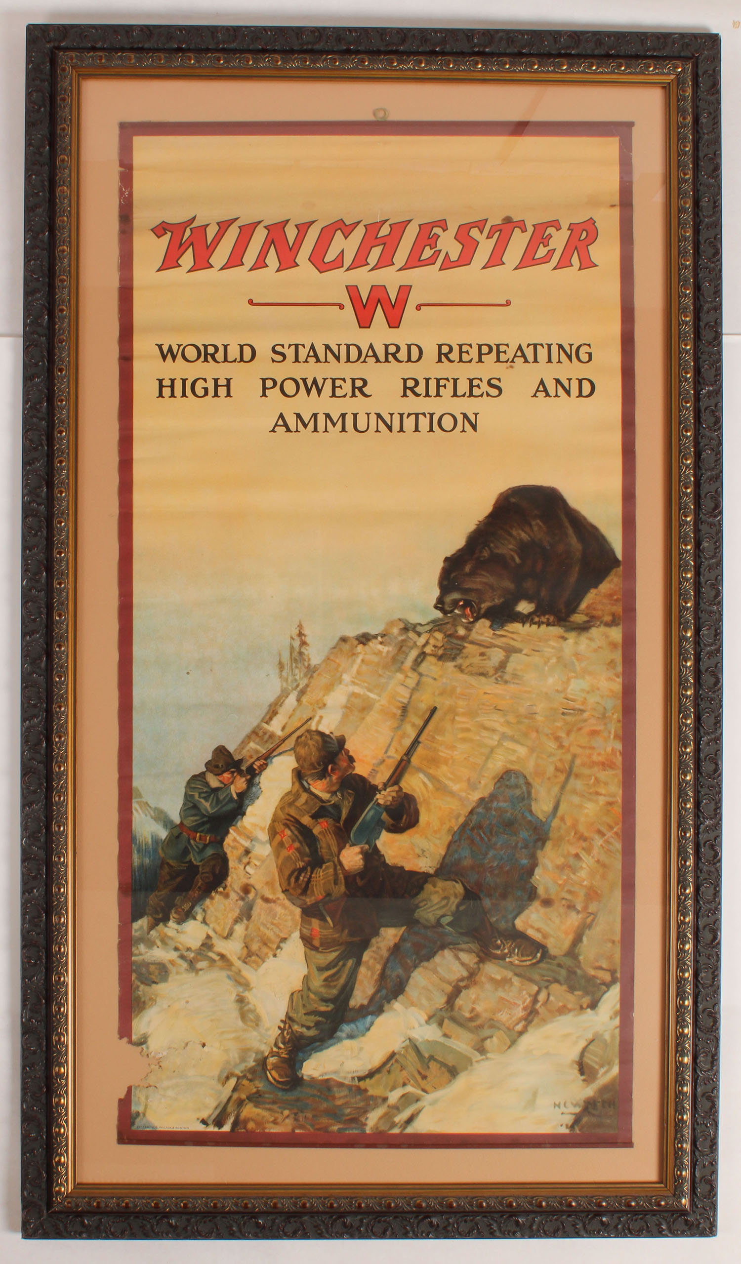 RARE Winchester poster, ''WINCHESTER W WORLD STANDARD REPEATING HIGH POWER RIFLES ANS AMMUNITION'', pictures two hunters on cliff with grizzly bear on the attack from above in snow scene, by N.C. Wyeth, has piece missing to lower left corner, small tear to top right otherwise excellent with bright colors, bands top & bottom with brass hanger, 18'' x 36'', framed. Grade: Very Good ++ - Value: 2000 to 4000