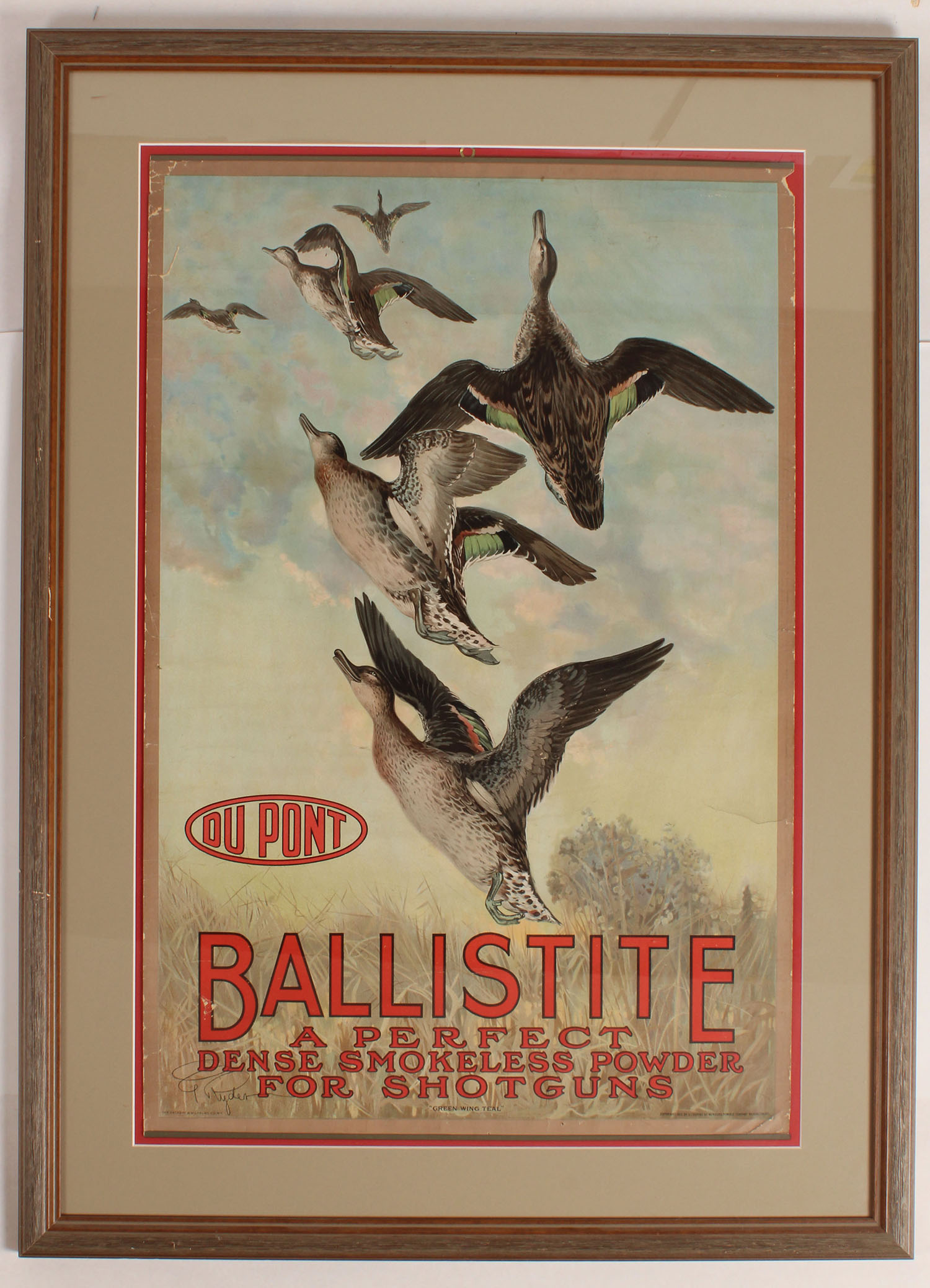 RARE DUPONT BALLISTITE Poster pictures Green-wing Teal in flight, dated 1913, has metal bands top & bottom with brass hanger, all original, wonderful full color image with teal up close & flying straight up, has edge wear other wise great colors, 20'' x 30 1/4'', framed, Rare & hard to find! Grade: Excellent - Value: 2000 to 4000