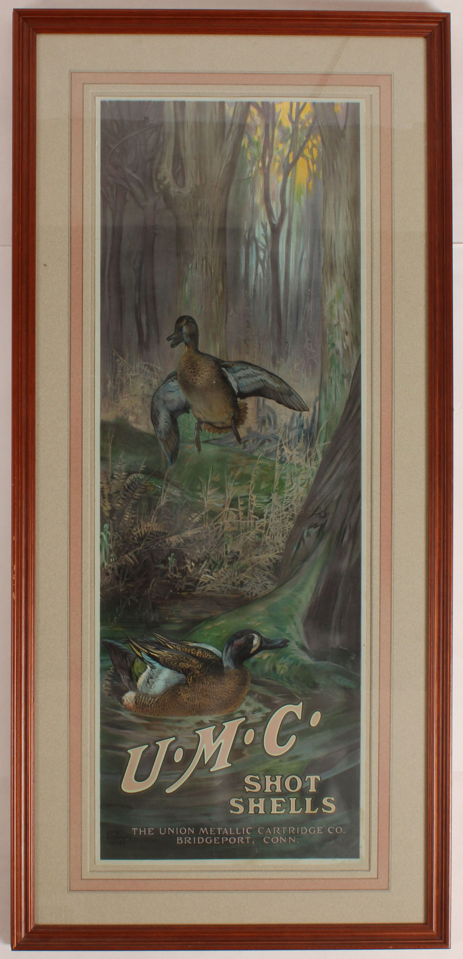 Exceedingly Rare U.M.C. Poster, promotes Shot Shells, pictures a wonderful full color image of blue wing teal landing on water in a tree setting, Artis Lynn Bogue Hunt, no bands, dated 1907, framed & matted. Very Few of these come up for sale. Grade: Excellent - Value: 1000 to 4000