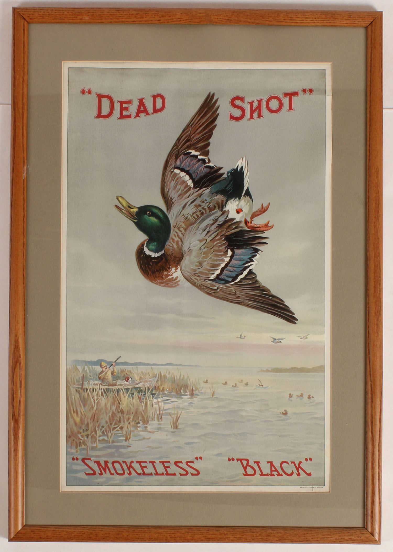 ''DEAD SHOT'' ''SMOKELESS'' ''BLACK'' Poster, has great full color image of falling duck logo with hunter in background & dog in boat with decoys, has brass bands top & bottom with hanger, image size 13 1/2'' x 21 1/2'', framed, one light roll wrinkle at top, absolutely wonderful colors. Grade: Excellent ++ - Value: 2000 to 4000