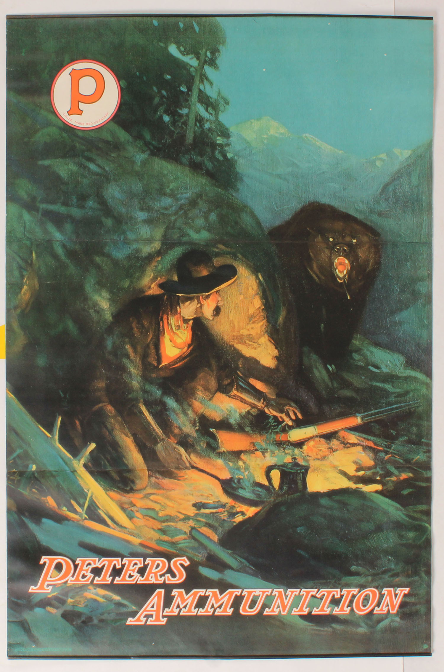 Peters Ammunition Poster pictures a grizzly bear on the attack into camp fire seen at night, shows hunter reaching for his lever rifle, this was always a dark image but this one is the brightest we have seen, very collectible, has bands top & bottom with brass hanger, this poster is near mint other than it was folded in thirds at one point & the two creases have been professional touched up, 20'' x 30 1/4'', great colors. Grade: Excellent - Value: 1500 to 4000
