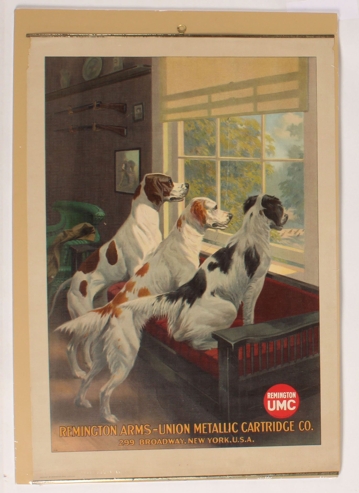 Remington UMC Poster, pictures three hunting dogs looking out the window at a covey of quail running, has brass bands top & bottom with brass hanger, 17'' x 24 7/8'', great colors with almost no edge wear. Grade: Excellent ++ - Value: 1000 to 3000