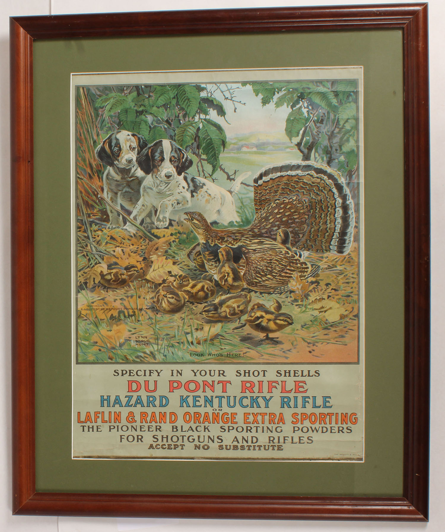 1912 Du Pont Poster ''LOOK WO'S HERE!'' by Lynn Bogue Hunt, pictures a cute image of two puppies looking at ruffed grouse with their babies, has metal bands top & bottom but no hanger, 18 3/4'' x 25 1/8'', has grit color & some light edge wear. Grade: Excellent - Value: 1000 to 2000