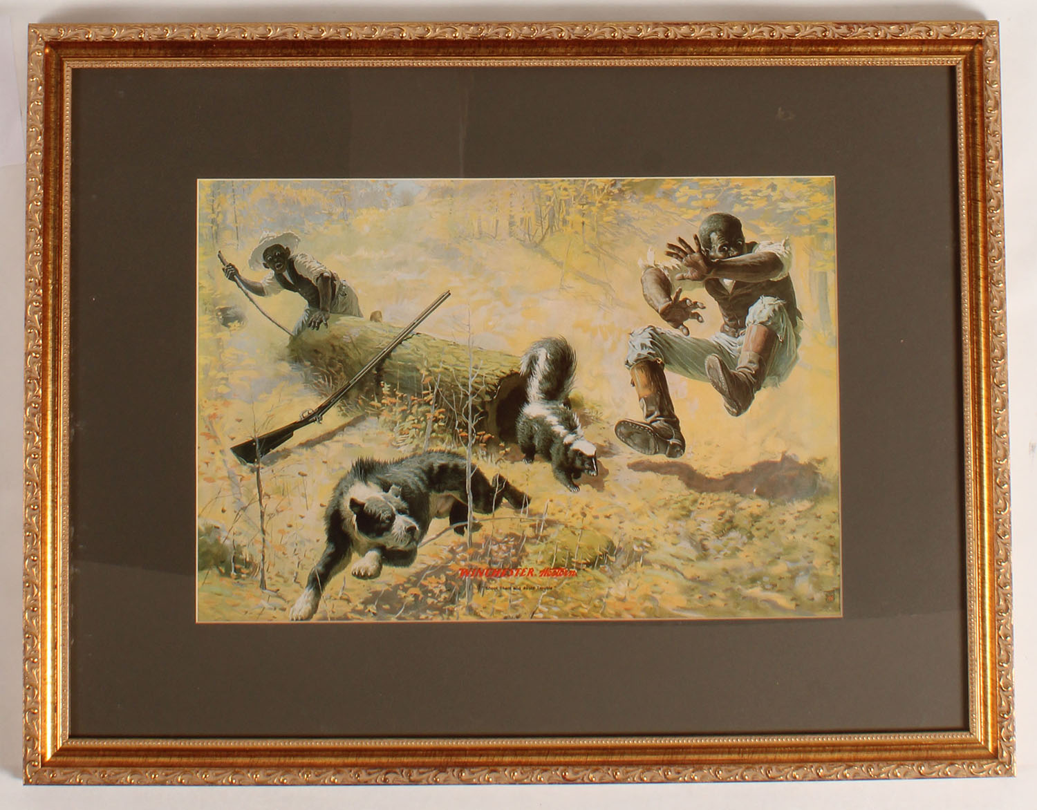 Winchester-Western Poster, ''SHOOT THEM TO AVOID TROUBLE'', reproduced in the 1970's, this one is much smaller than the original version, 17'' x 12'' image size, pictures two hunters and a dog trying to get away form a skunk, framed & matted. Grade: MINT - Value: 100 to 500