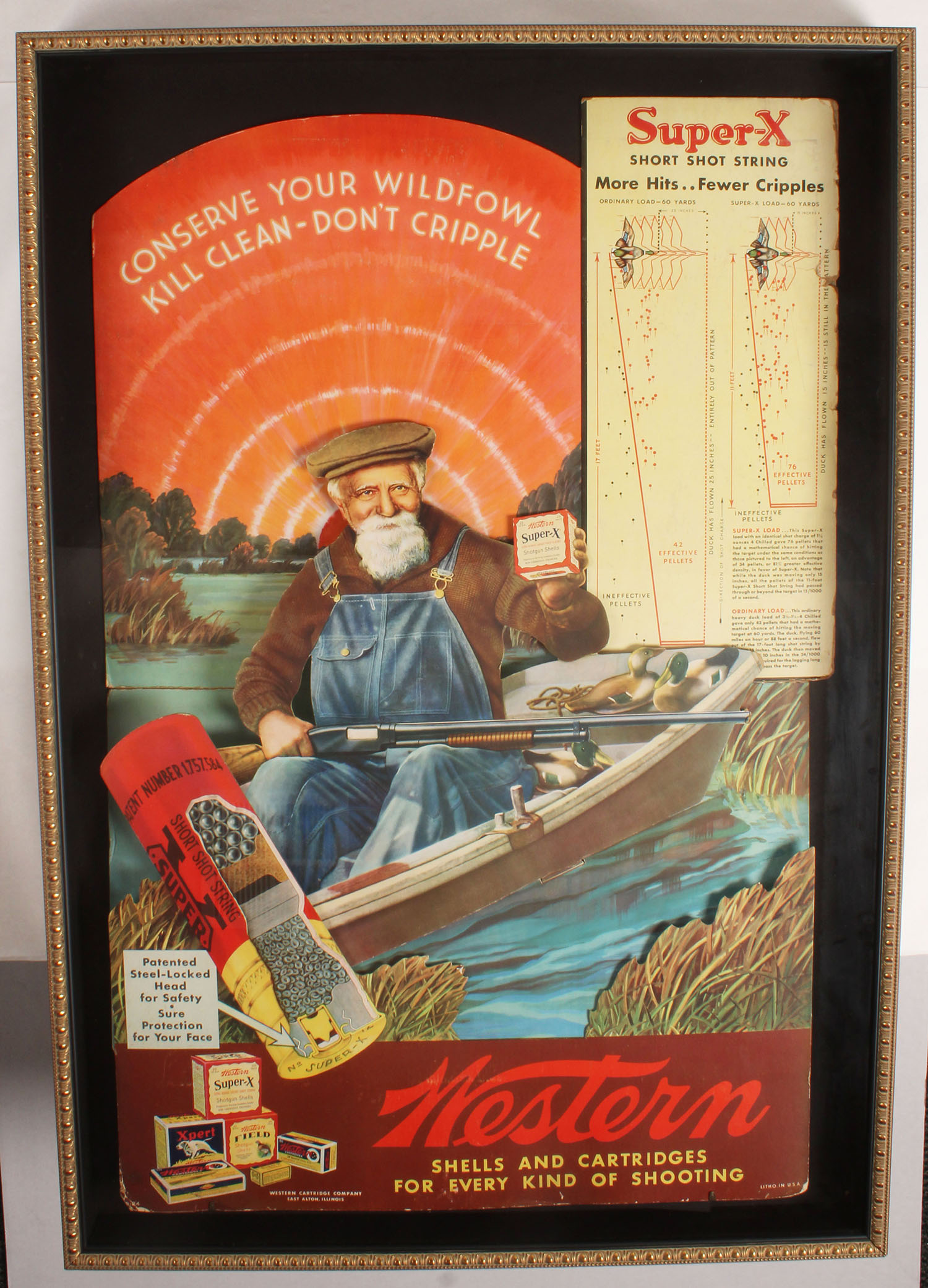 RARE Western 3D Diecut, pictures old hunter in a boat with duck decoys out front holding a pump shotgun, box of shotshell with a large red shot shell, background has a sunset over a lake & shot patterns to the right, shows only light edge wear & a fold mark at center otherwise colors are fantastic, 100% complete & all original, 28'' 44'' x 3'', framed in a 3D shadow style frame, will be hard to ship in the frame, VERY RARE & ONLY ONE WE HAVE SEEN! Grade: Excellent + - Value: 1000 to 5000