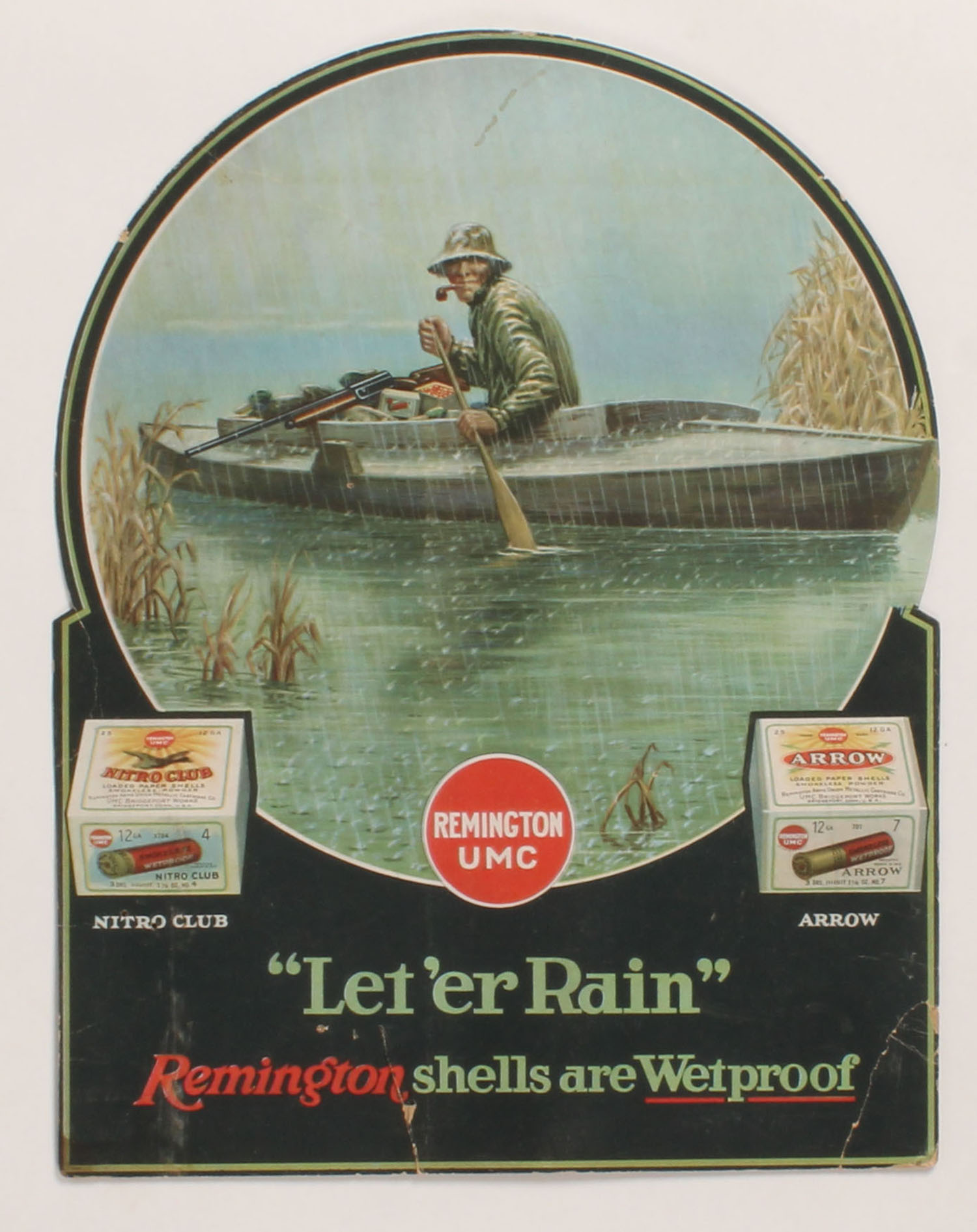Remington Diecut LET'ER RAIN, pictures hunter in a duck boat (which is different man and boat then the calendar) with decoys & a gun in the pouring down rain, has two 2pc shotshell boxes, has an added period easel back over a modern white reinforcement at bottom, has a few creases, nice colors, 12'' x 15 3/8''. Grade: Very Good ++ - Value: 400 to 2000
