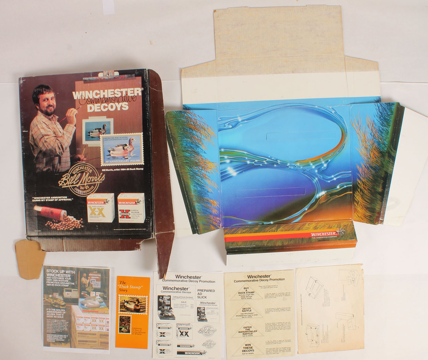 Winchester/Bill Morris decoy diecut with paperwork, nice full color diecut promoting Bill's decoys, 16'' x 24 1/4'' x 16''. Grade: Excellent - Value: 2 to 30