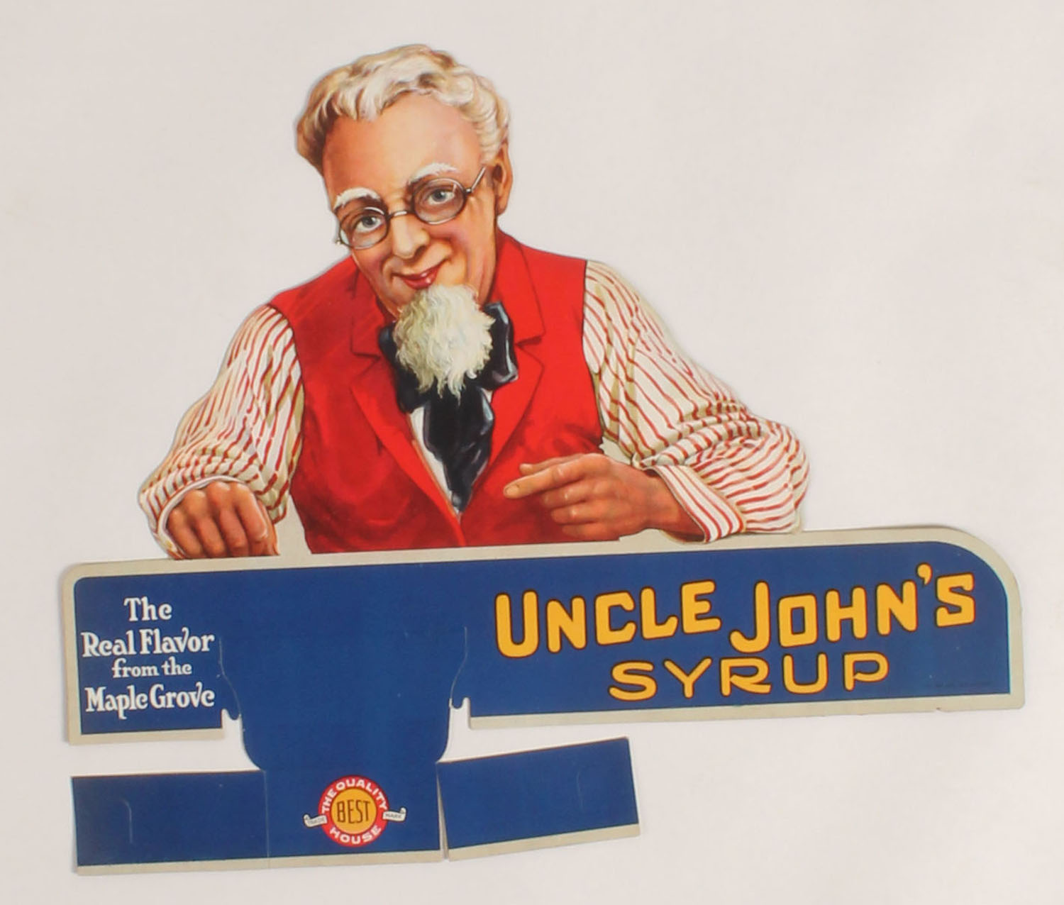 Uncle John's Syrup diecut, has bright vivid colors, 16 1/2'' x 14''. Grade: MINT - Value: 20 to 200