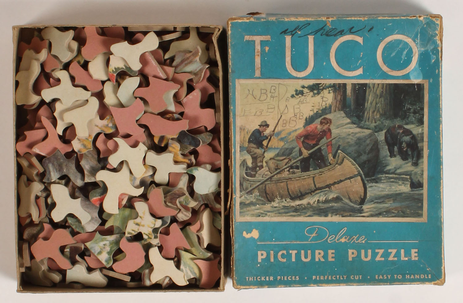 Philip R Goodwin Puzzle, pictures two hunters in birch canoe with black bear close by on shore, 19'' x 15'', has original box with some tears, one piece is missing, still nice image. Grade: Very Good - Value: 10 to 50