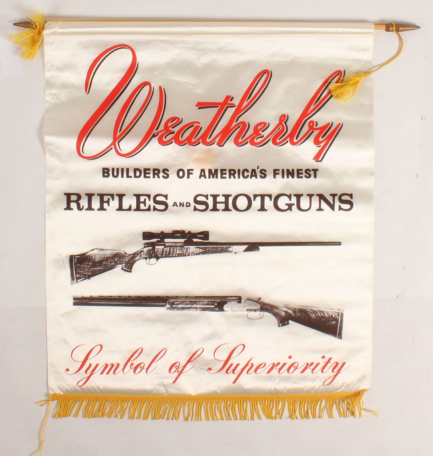 Weatherby banner, ''WEATHERBY BUILDERS OF AMERICA'S FINES RIFLES AND SHOTGUNS'', white, red & black, all complete, 22'' x 27''. Grade: Excellent ++ - Value: 30 to 100
