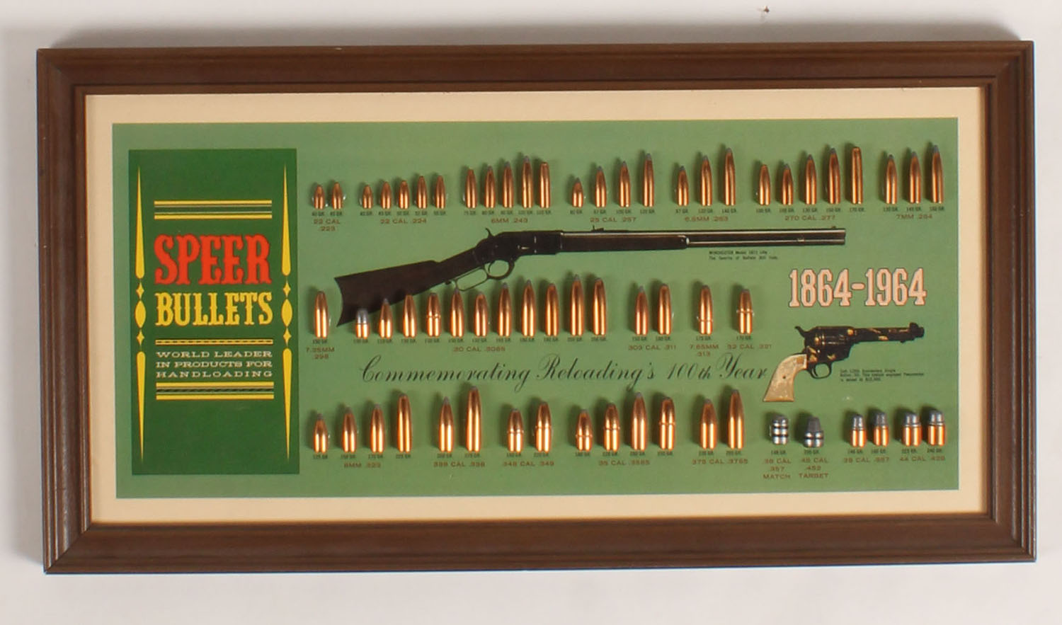 Speer Bullet Board, pictures Model 1873 Winchester & Colt SAA revolver, all bullets intact. Grade: Excellent + - Value: 100 to 300