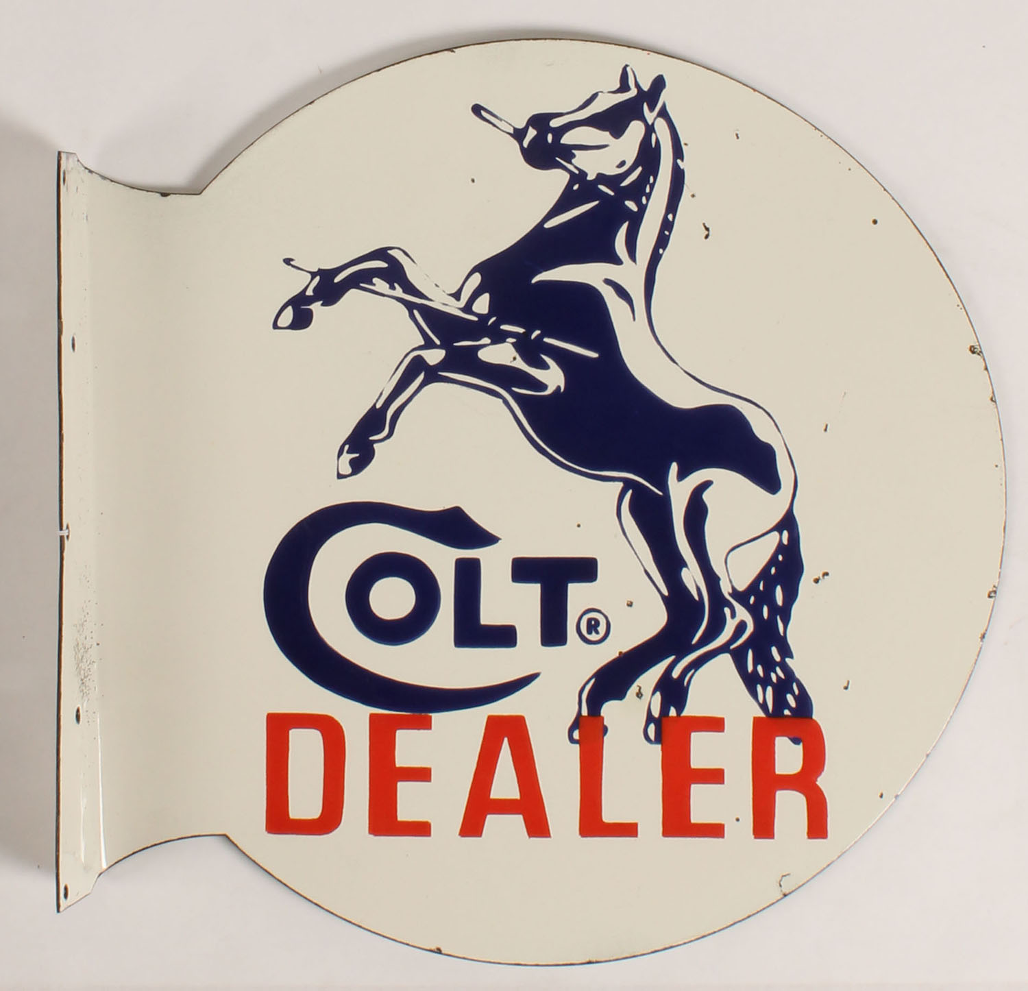 Colt DEALER modern porcelain metal sign. Double sided with a 90 degree flange for mounting on outside of a sporting goods store. 18'' dia., Grade: Excellent - Value: 300 to 1000