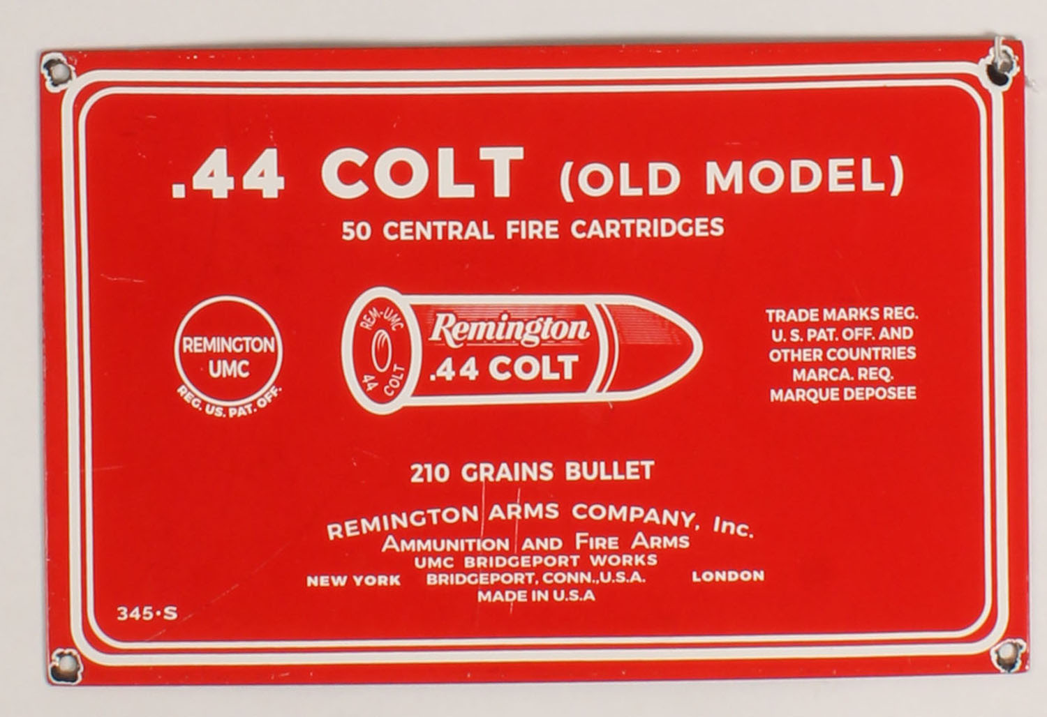 Remington .44 COLT (Old Model) porcelain metal sign, 14'' x 9'', same image as the top of ammo box. Fantastic color, Grade: Excellent ++ - Value: 50 to 250