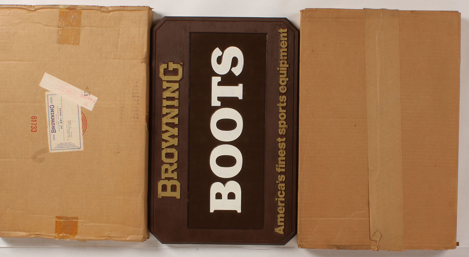 Lot of 3 Browning advertising signs for sporting goods store, ''BOOTS, CLOTHING, CAMPING'', all are in original shipping boxes. Grade: MINT - Value: 20 to 200