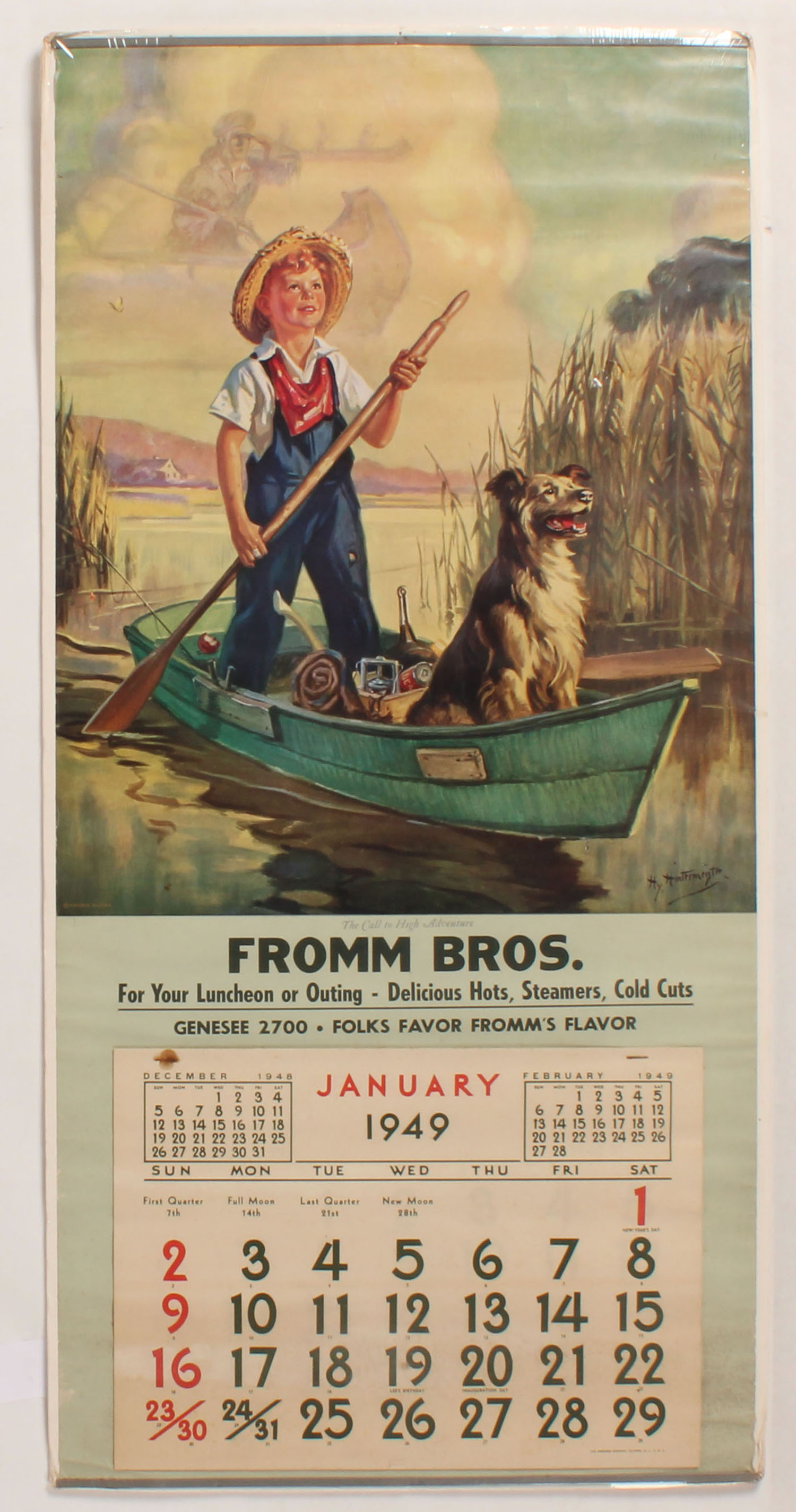 1949 young boy & his dog in a boat calendar, by Hy Hintermeister, full pad of pages, 16'' x 33 1/2''. Grade: Excellent - Value: 10 to 100