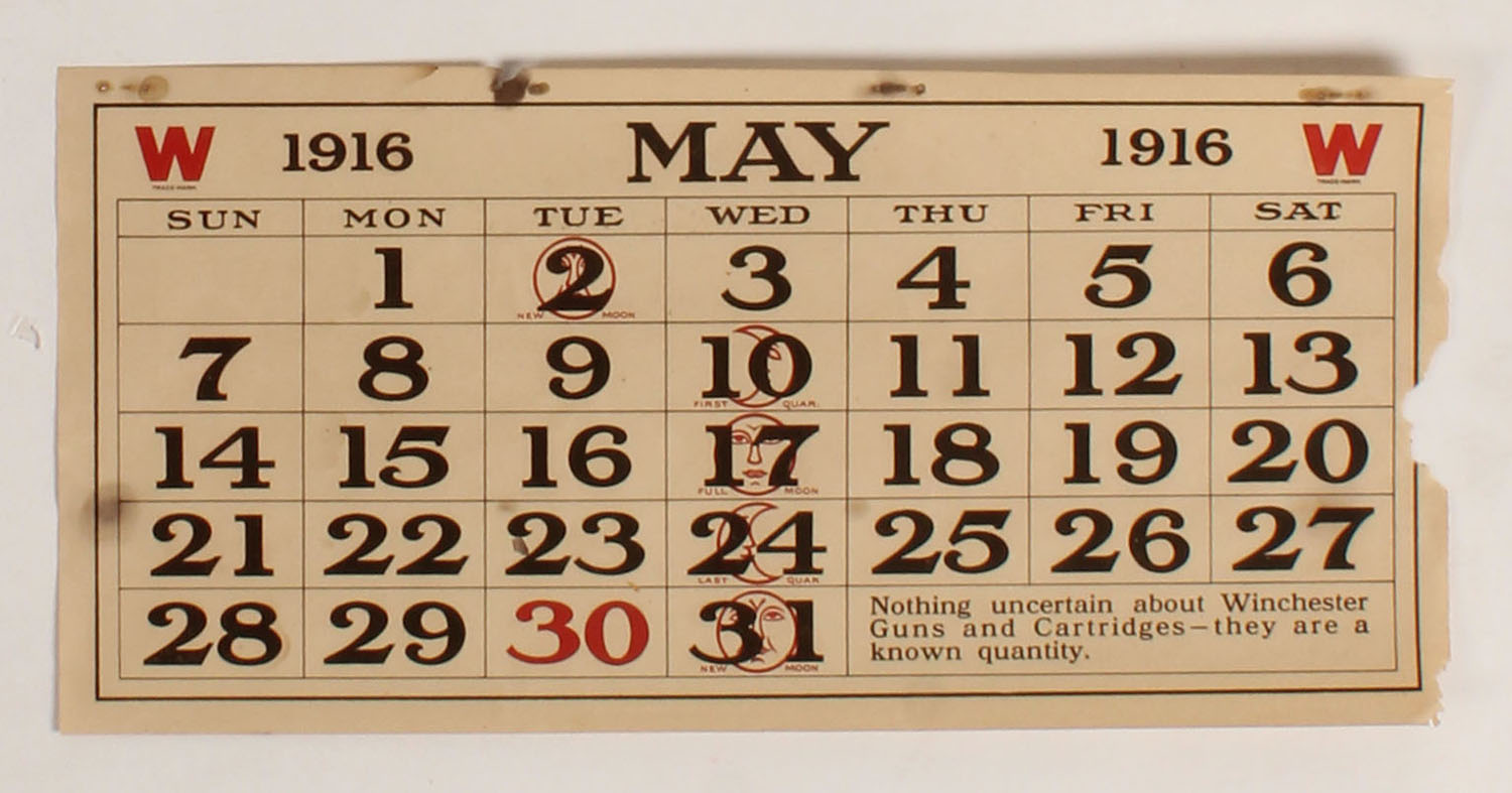 1916 Winchester May calendar page, has a few small stains & edge wear. Grade: Very Good ++ - Value: 40 to 150