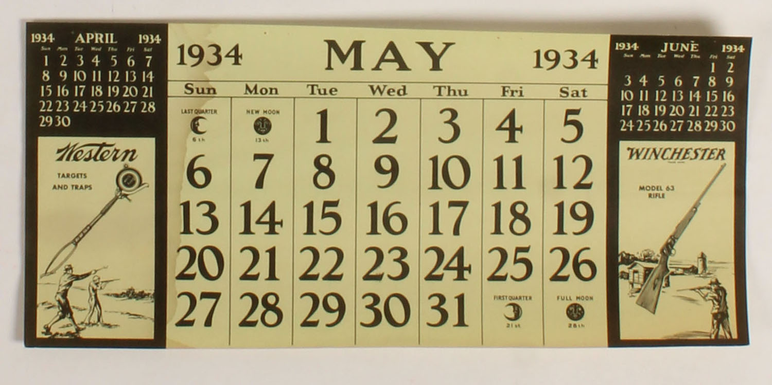 1934 Winchester-Western May calendar page, has a stain to left side. Grade: Very Good ++ - Value: 40 to 150