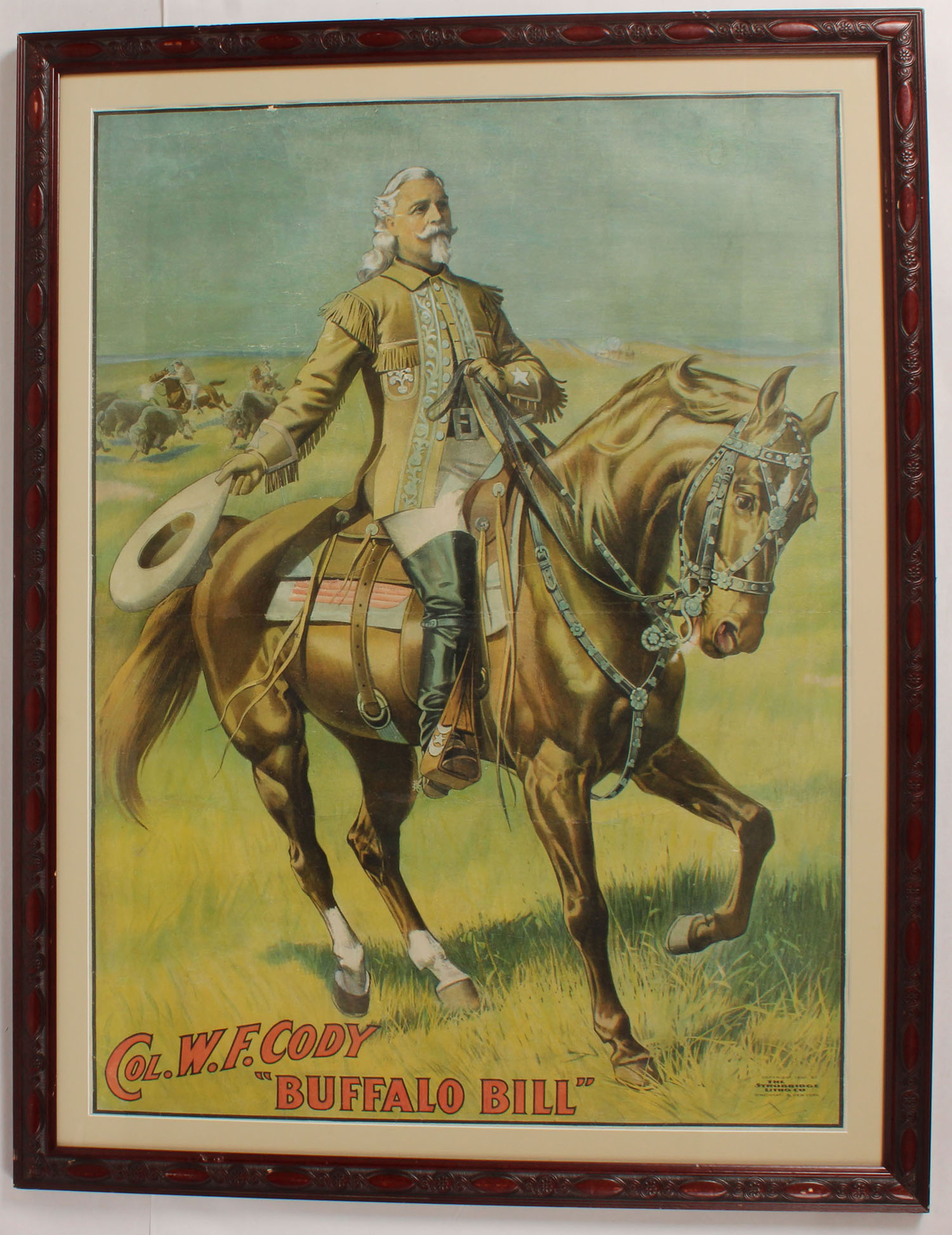 Very Rare Col. W.F. Cody BUFFALO BILL Poster, depicting Buffalo Bill on horseback, nice color and graphics, Copyright 1907 by The Strobridge Litho Co, 27 x 36 1/2'', framed. Grade: Excellent - Value: 500 to 3000