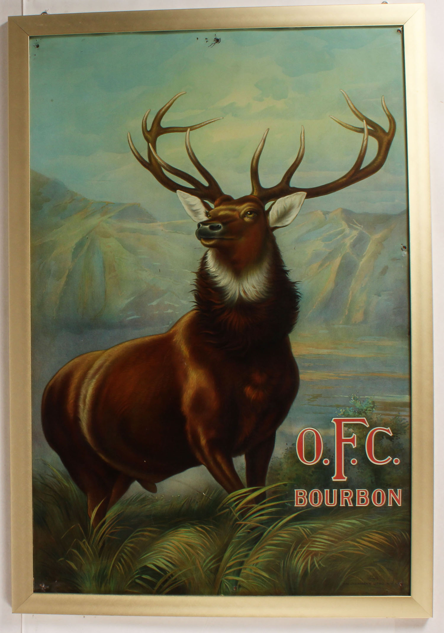 Old Fashioned Copper Bourbon metal sign, in 1870 E.H. Taylor Jr. christened is now distillery using all copper stills, piping & fermenters, pictures a large Elk or Stag with lake & mountains in background, has great colors with a few small holes, 23 1/2'' x 35'', framed. Grade: Excellent - Value: 200 to 2000