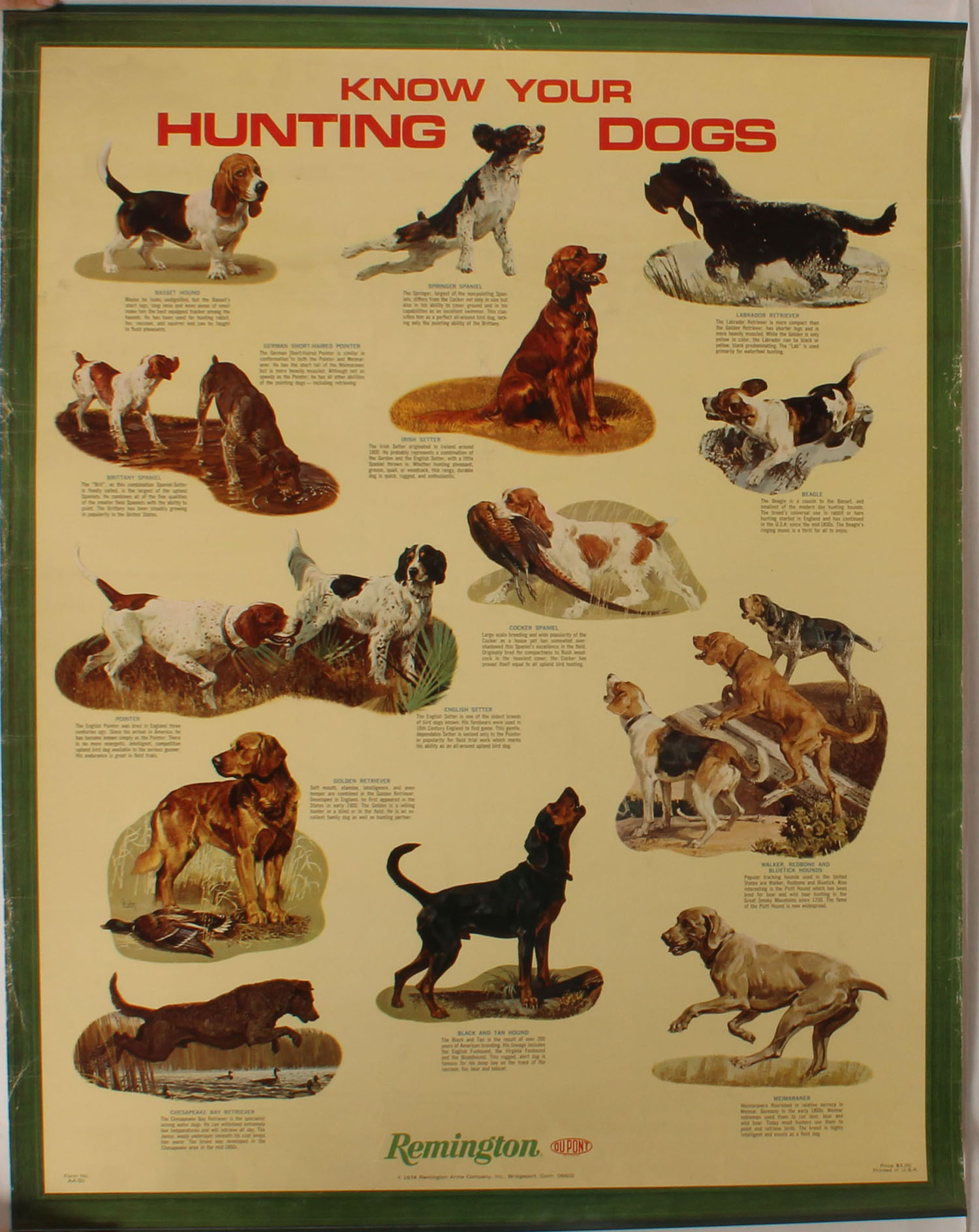 Remington Poster, Know your Dogs, 23'' x 29 1/2'', bands top & bottom with no hanger, some edge wear. Grade: Very Good ++ - Value: 20 to 100