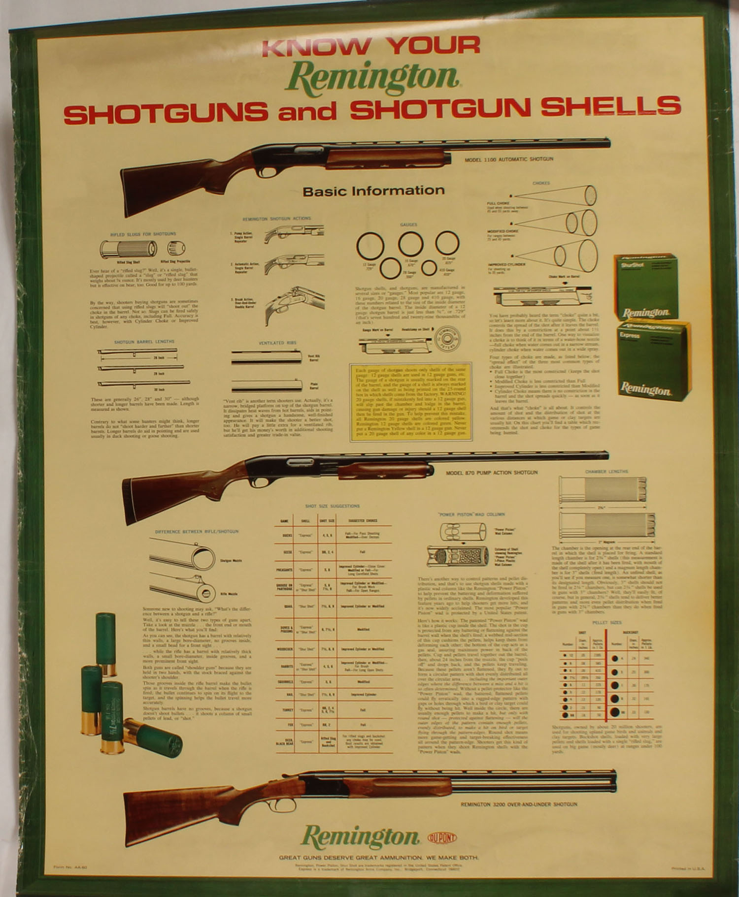 Remington Poster, Know your Shotguns & shot shells, 23'' x 29 1/2'', bands top & bottom with brass hanger, some edge wear. Grade: Very Good ++ - Value: 20 to 100