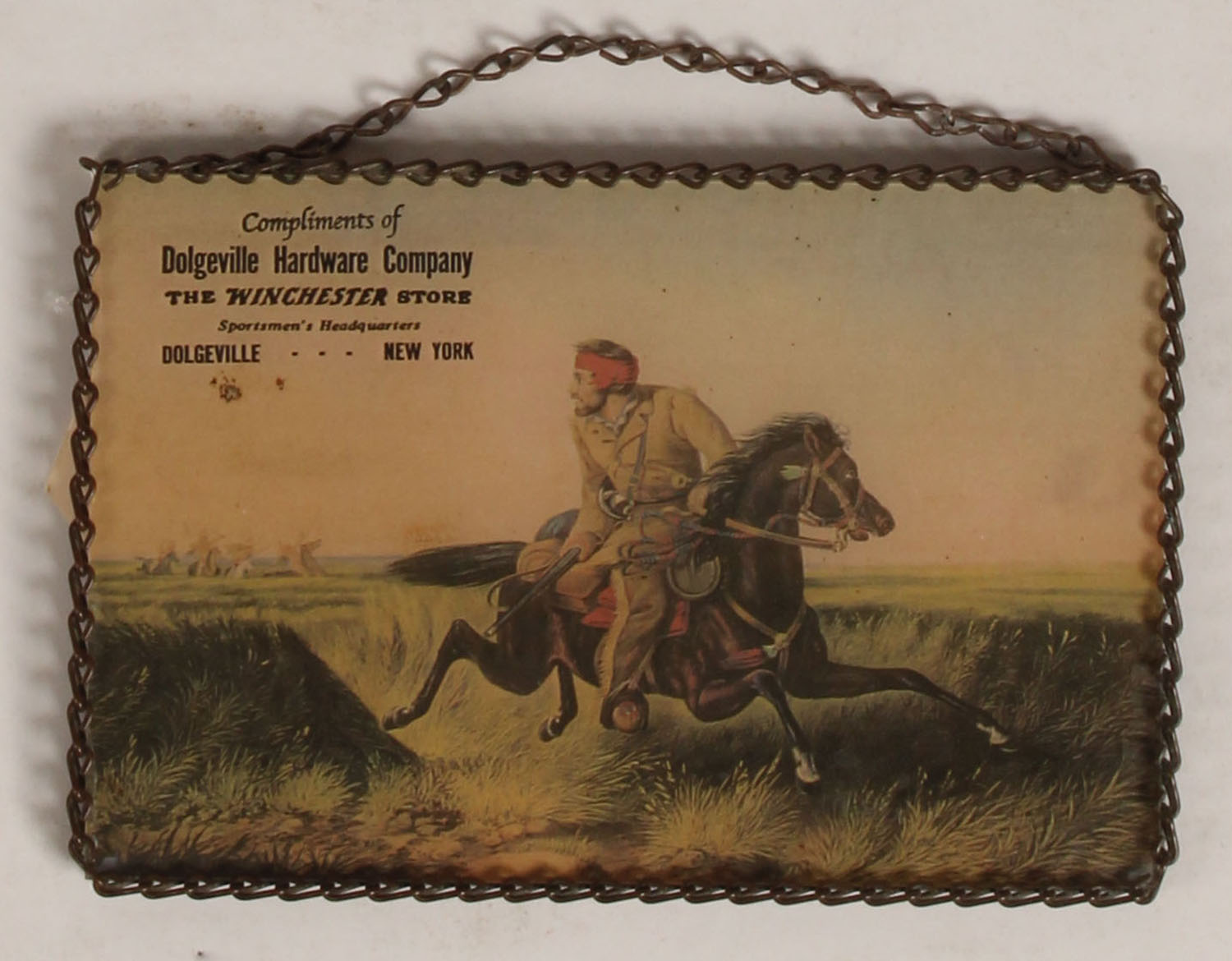 Winchester Chain Art, pictures mountain man on horseback running away form Indians, 7'' x 5'', not produced by Winchester. Grade: Excellent - Value: 50 to 150