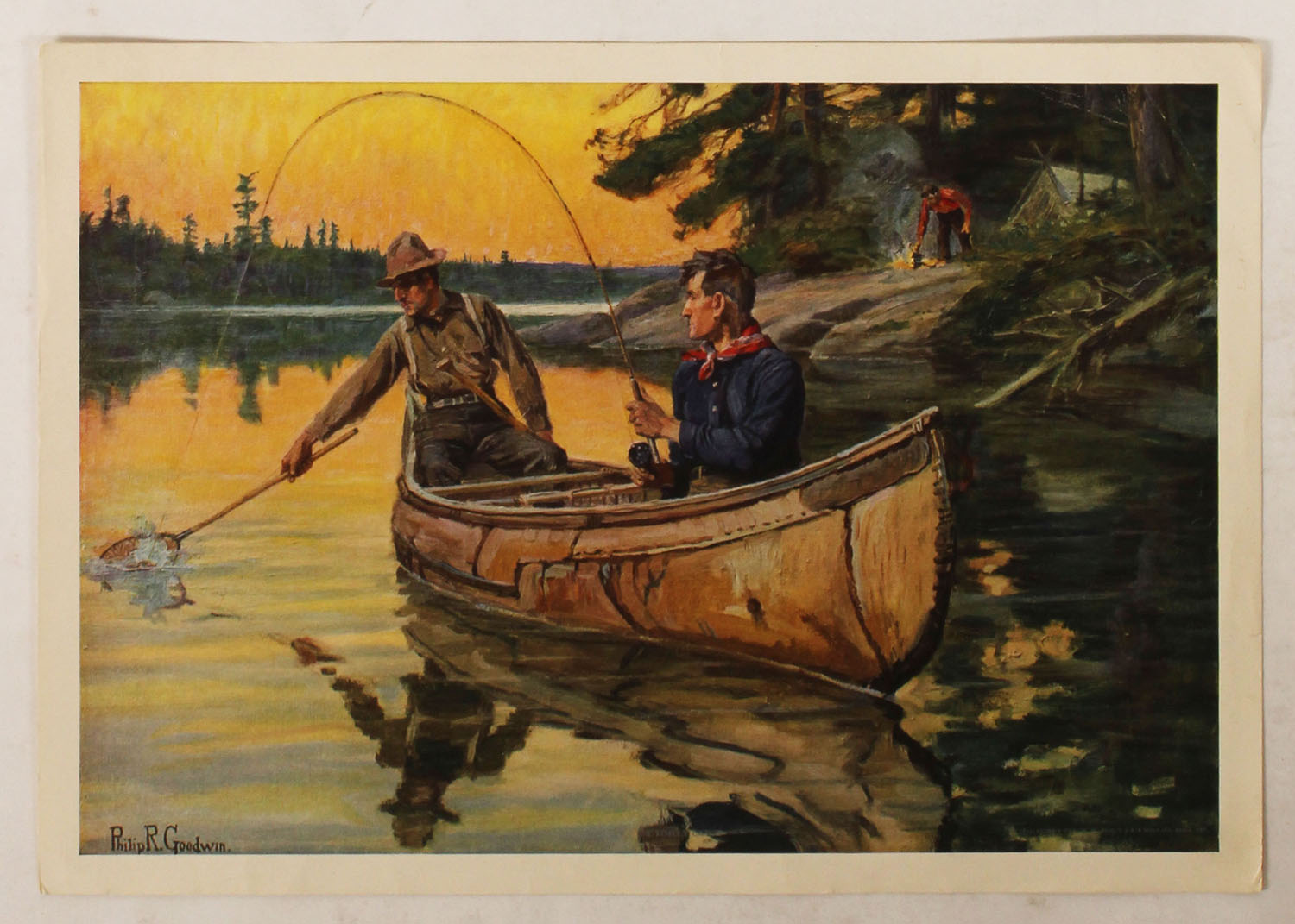 Philip R Goodwin print, A Timely Catch, pictures two fisherman in birch canoe landing a fish for dinner with camp fire in background, 9'' x 9 3/8''. Grade: Excellent ++ - Value: 40 to 150