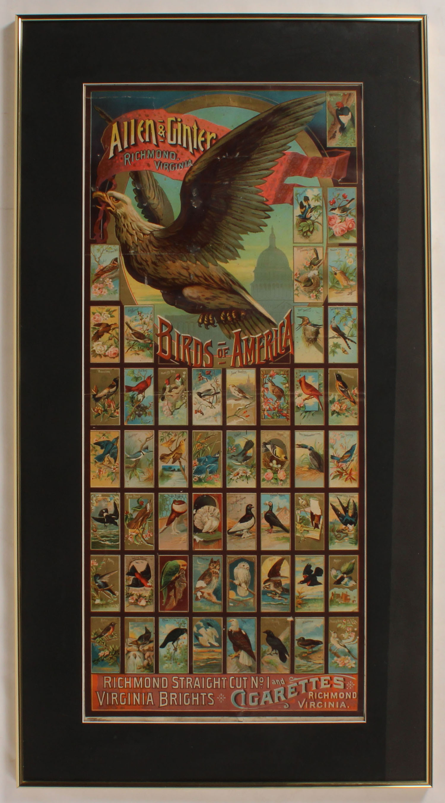 Outstanding full-color advertising poster (13.25 x 30 inches, visible dimensions) for the N4 ''Birds of America'' set issued by Allen & Ginter in circa 1888. Produced by ''Geo. S. Harris & Sons Phila., New York & Chicago'' as noted in print along the base. The banner, which advertises for Richmond Straight Cut No. 1 and Virginia Brights Cigarettes, pictures all fifty cards offered in the set. Catalogued G3 in the original American Card Catalog, this extremely rare tobacco banner is one of the ACC's most highly valued items. In the 1930s Jefferson Burdick assigned it a value of $10 at a time when the most valuable of all cards, the T206 Honus Wagner, was valued at a very impressive $50. These banners were produced by tobacco companies for display in tobacco stores to promote their particular brands and card issues. They are perhaps the most finely produced of all advertising displays relating to card collecting and are considered by many to be the greatest prizes of all nineteenth-century tobacco-card collecting. The offered banner displays numerous creases and light rippling. The colors remain bright and crisp. Technically in Fair condition but Excellent in its overall appearance. Matted and framed - Value: 200 to 2000