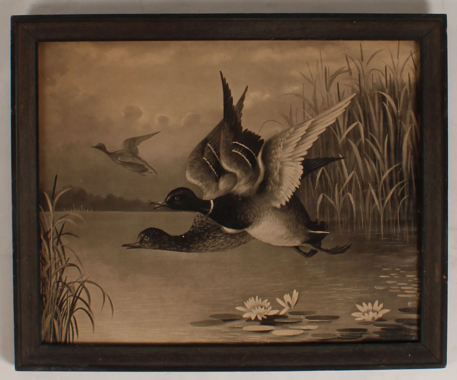 Early print of mallards flying over marsh lake, artist name is hard to read (Le R??), circa 1890's, framed with no glass, 20'' x 16''. Grade: Excellent - Value: 50 to 250