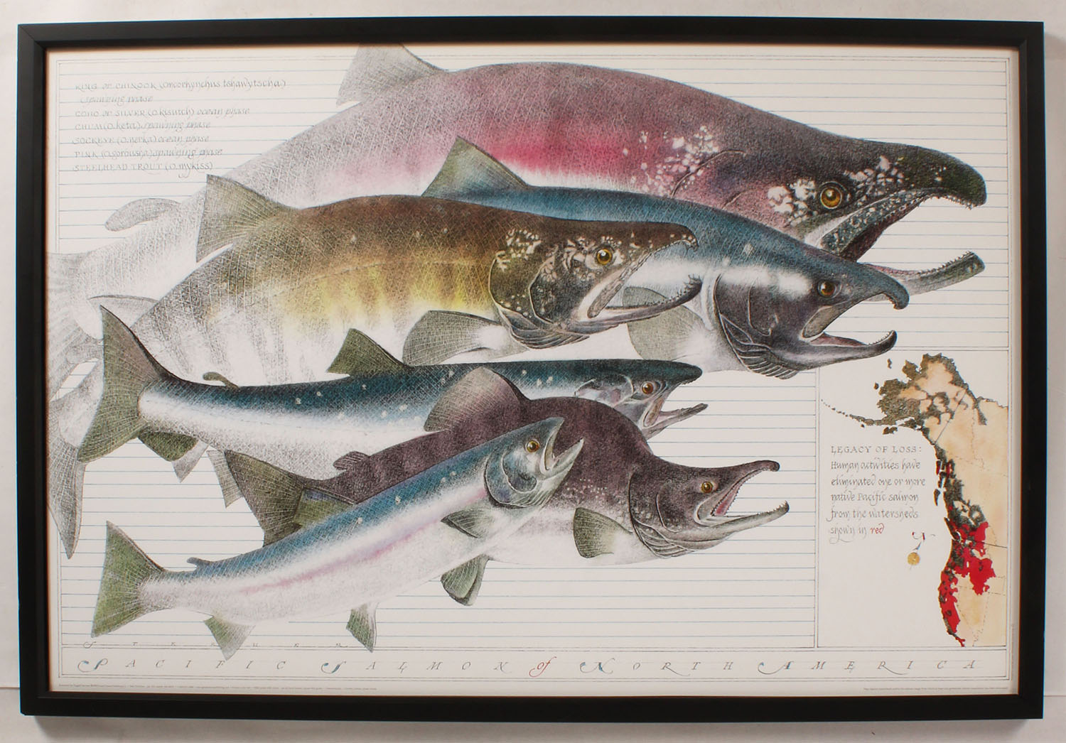 Pacific Salmon of North America print, pictures 6 salmon with a chart of where humans have had an effect on them in the western part of the USA, 1998 eco trust. 36'' x 24'', framed. Grade: MINT - Value: 20 to 200