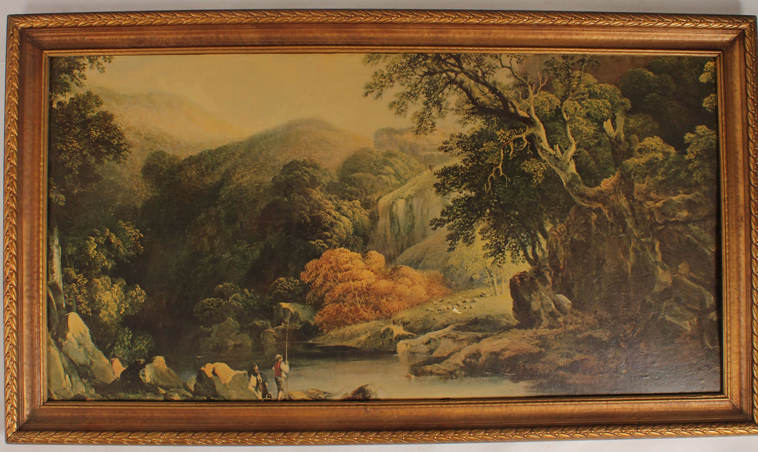 Thomas Walmwley (1763-1806) ''Enchanted Valley'' print on board, pictures fisherman surrounded by large valley & mountains, 46 1/2'' x 24'', framed. Grade: Very Good ++ - Value: 26 to 500
