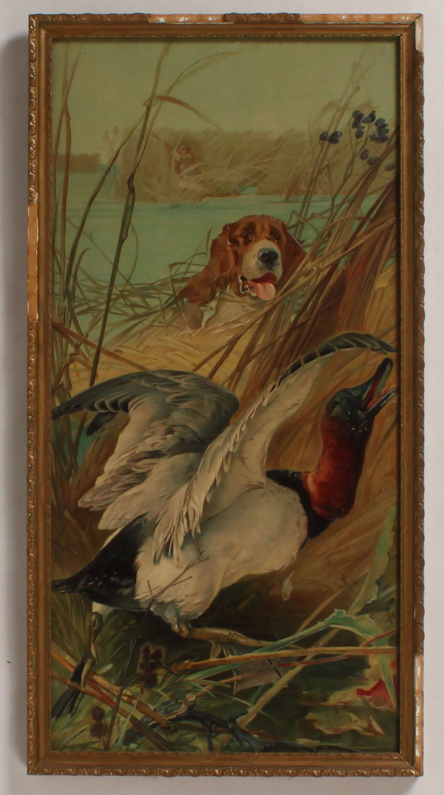 Embossed Eldon Swensson print, pictures dog chasing down a wounded canvasback with hunter shooting in the background, 11 1/2'' x 23 1/2'', framed. Grade: Excellent - Value: 20 to 80