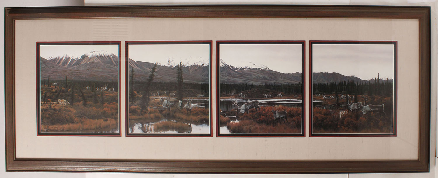 Way of the Caribou by Rod Frederick, pictures four scene of caribou in the same valley with mountains in background, total of 1000 in the series, 48'' x 12'' image size, framed, has paperwork on back - Value: 50 to 300