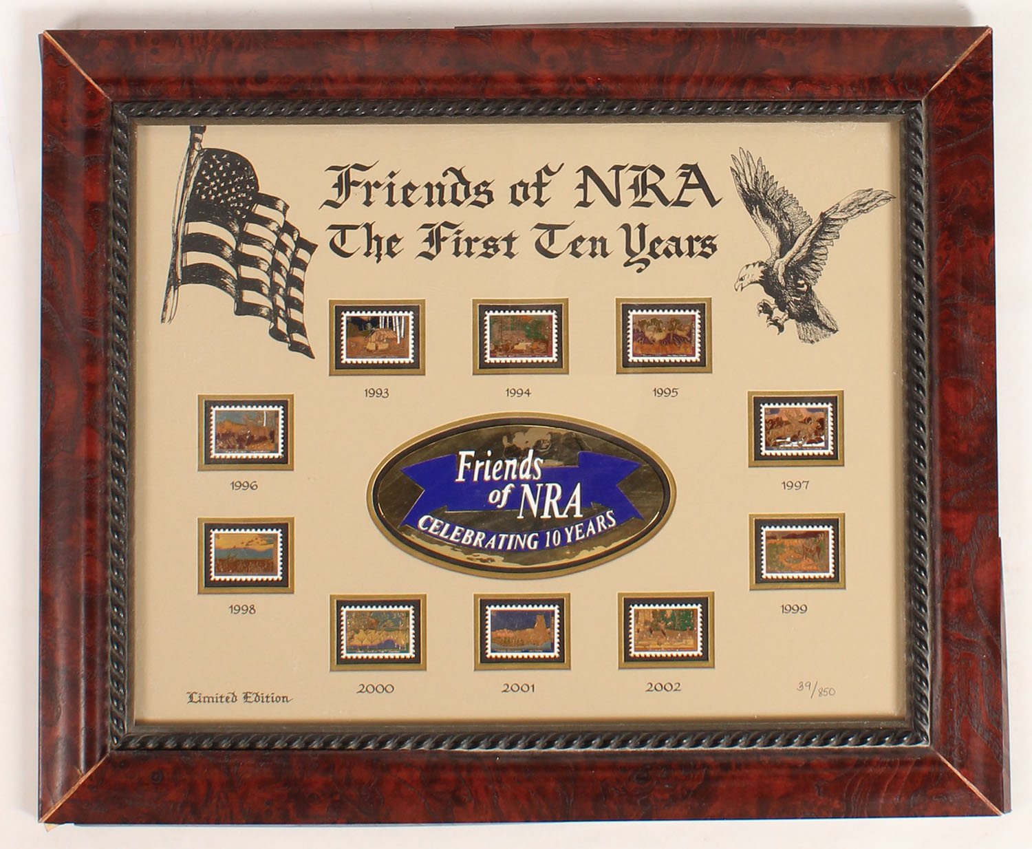 NRA first 10 year pins, 1993-2002, framed up very nice, 20'' x 17''. Grade: MINT - Value: 20 to 100