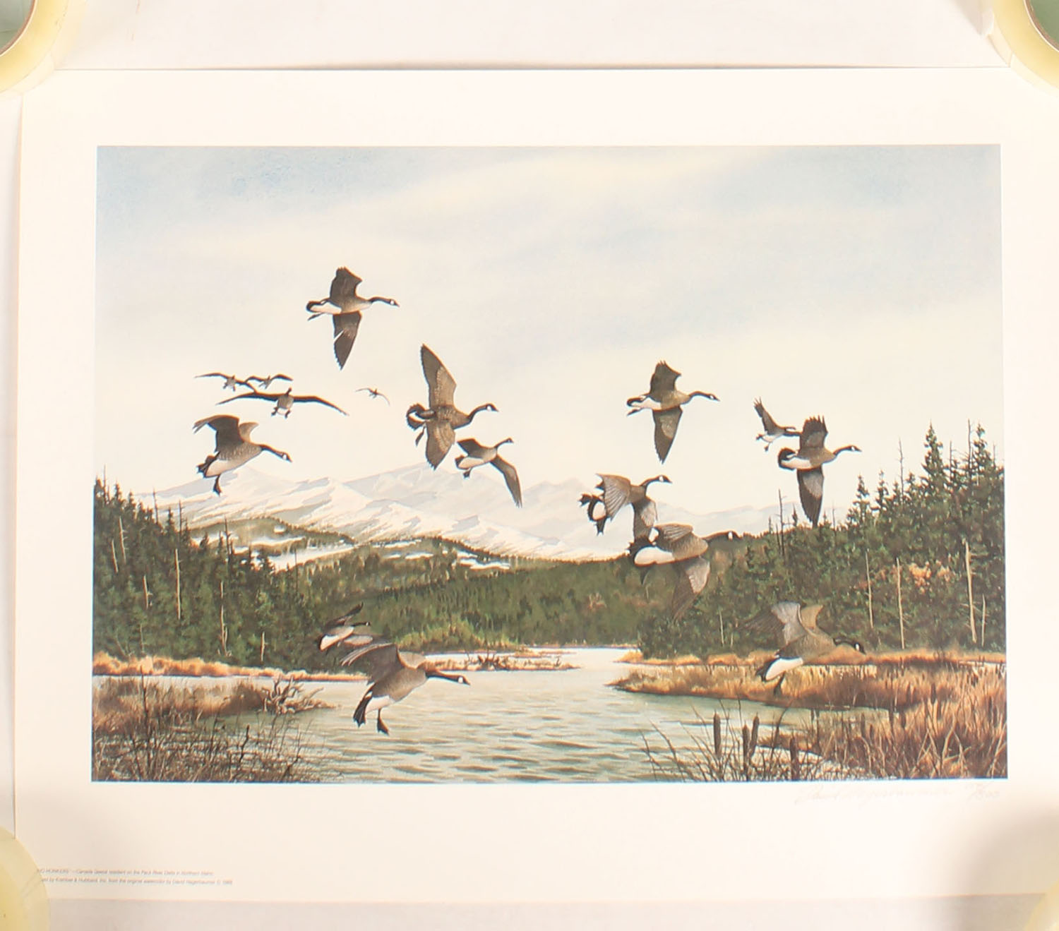 David Hagerbaumer IDAHO HONKERS, print pictures canada geese landing on lake with mountains in the background, 18'' x 12 1/2'' image size, 114/300. Grade: MINT - Value: 20 to 200