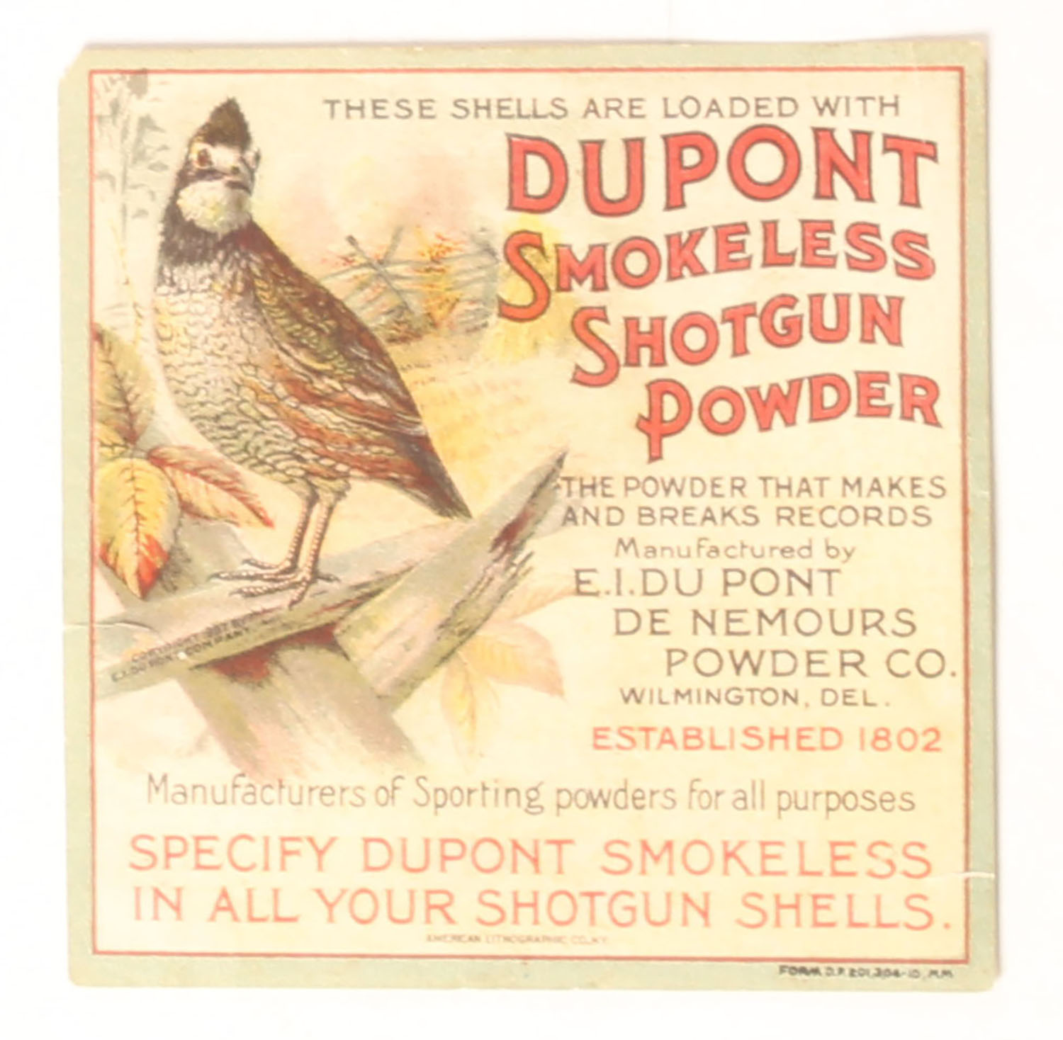 Dupont Powders Shotshell box insert, pictures quail on log with Du Pont NOT in oval, back is marked DUPONT. Grade: Excellent - Value: 30 to 100