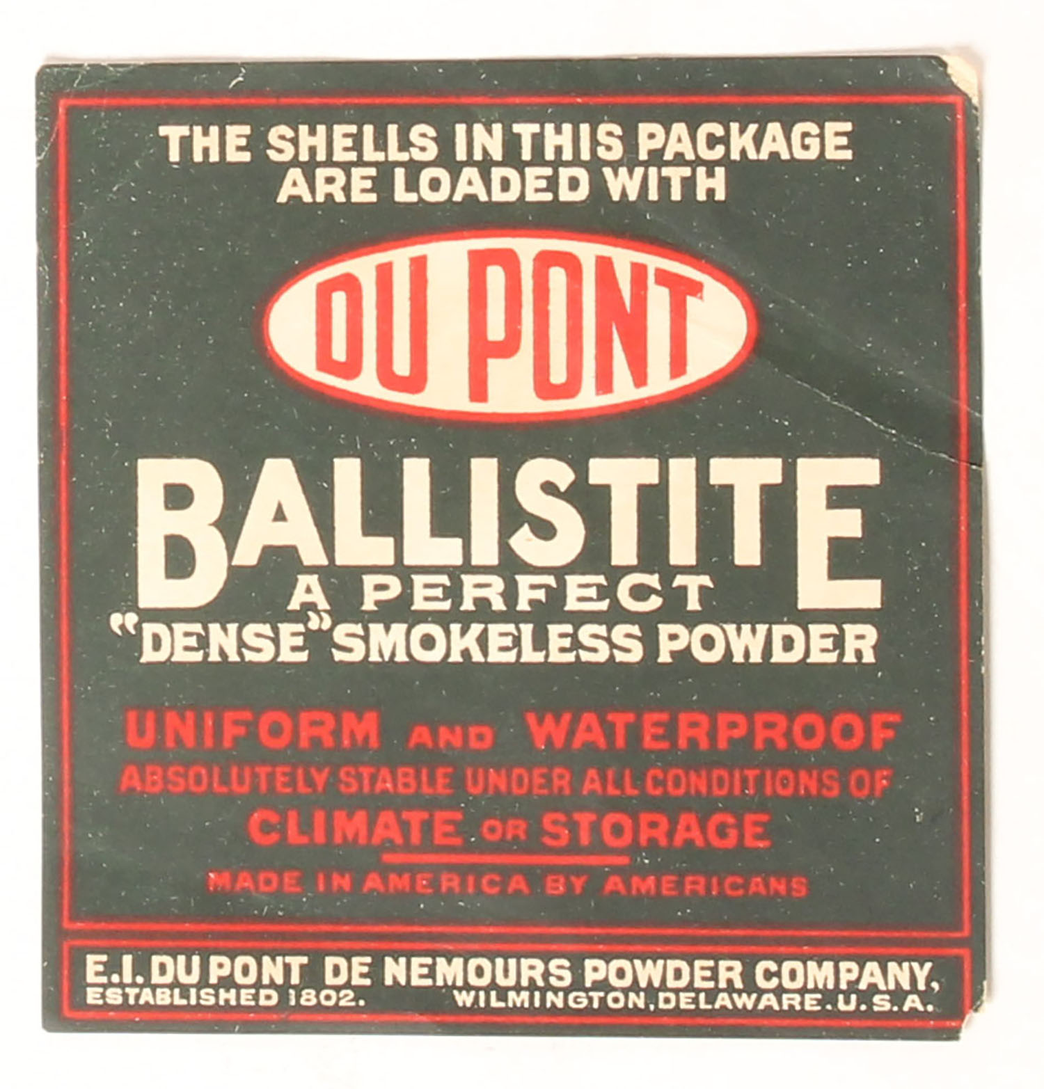 Dupont Powders BALLISTITE Shotshell box insert, back is marked DUPONT, BALLISTITE A PERFECT DENSE SMOKELESS POWDER. Grade: Excellent - Value: 10 to 100